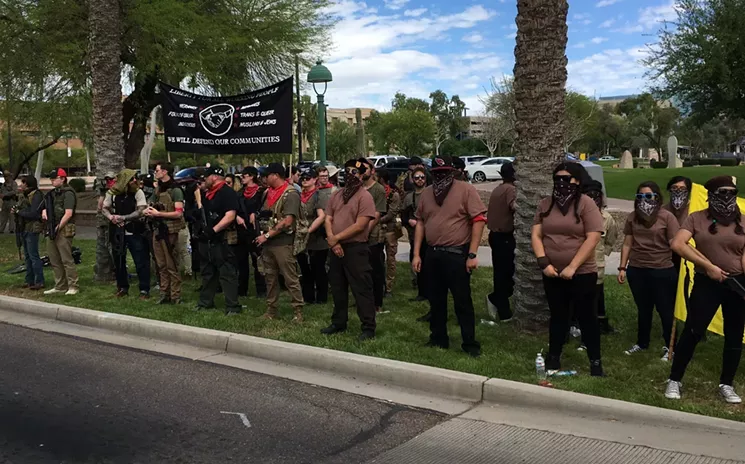 However, across the street, on the Wesley Bolin Memorial Plaza-side of 17th Avenue were the left-wingers, some of them masking their faces, some not. Many of them were armed with long guns. You know, just like the "patriot" groups.