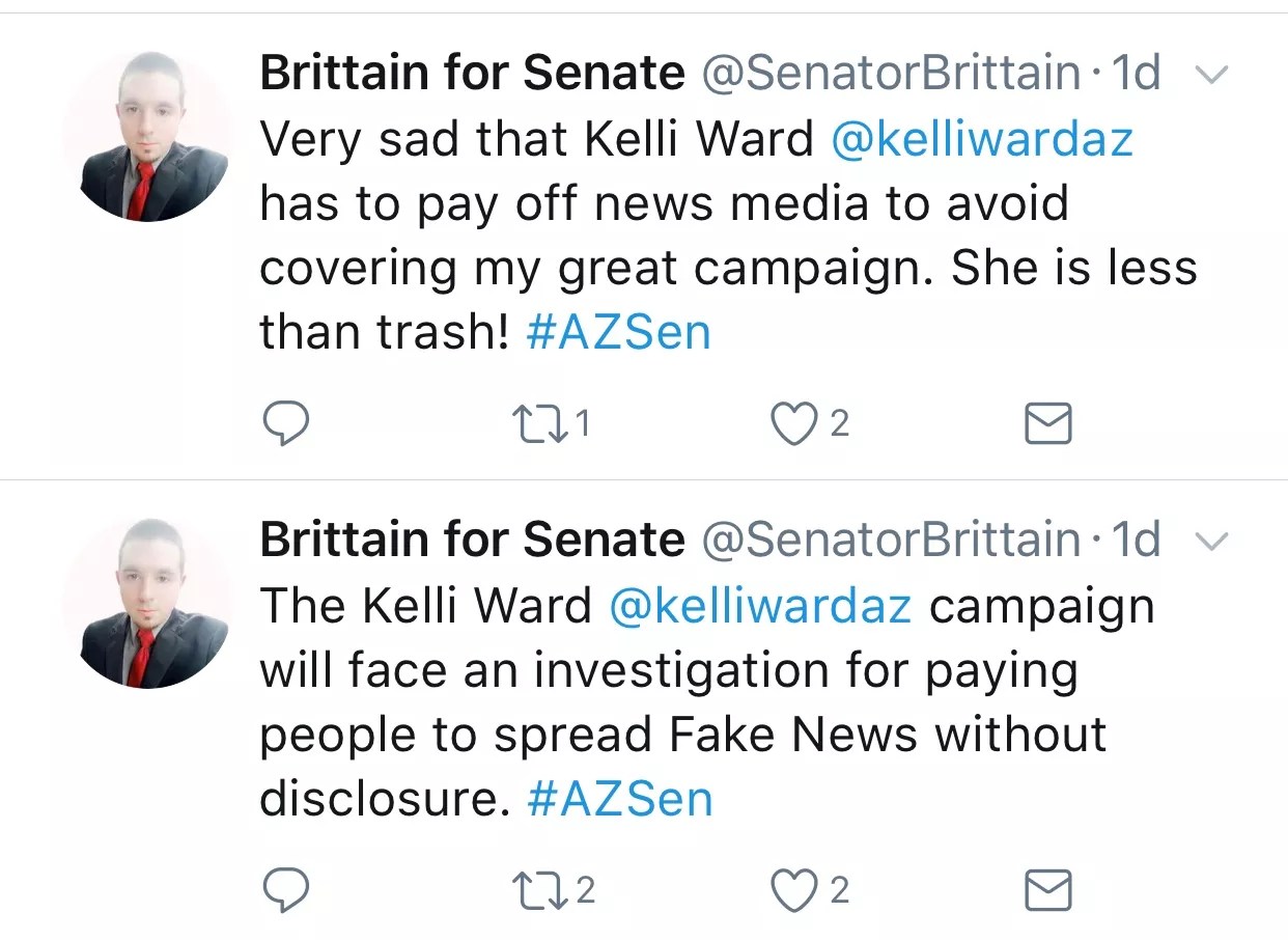 Despite frequently hurling insults at the “fake news media,” Brittain seems desperate to get their attention. He’s been tweeting at New York Times reporter Sheryl Gay Stolberg, the Arizona Republic’s Laurie Roberts, 12 News’ Brahm Resnik, and ABC15, accusing them of ignoring his campaign.