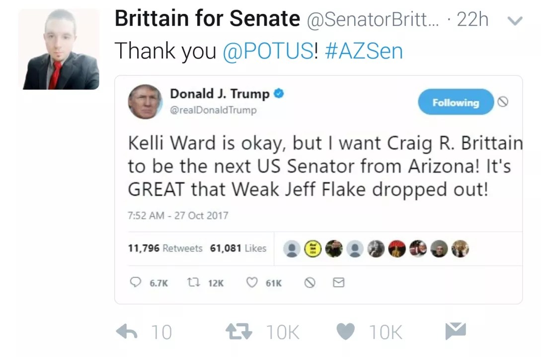 Then, on Monday, Brittain announced on Twitter that a new poll showed him in the lead among GOP candidates in Arizona’s 2018 Senate race.