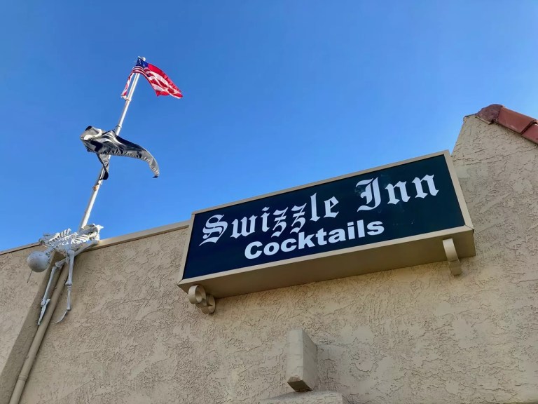 The first rule of Swizzle Inn: no Starbucks parking. The parking lot in this plaza at the southeast corner of 16th Street and Bethany Home Road is tight, and the Swizz can’t be sharing spots with the multitudes of Starbucks fiends the intersection attracts. Opened in 1996, Swizzle’s plain outside gives little indication of the fun within. Inside, there’s a very specific theme of Christmas at the beach. It is one of finest neighborhood bars in uptown Phoenix, a low-key place with a couple of TVs; a pool table; a jukebox pumping out Queen, The B-52’s and Willie Nelson; and a half-circle bar behind which the bartender pours nothing particularly fancy – but that’s not why you’re here. Just about every square inch of the ceiling is dressed with tinsel and lights sure to bring anyone a little cheer.