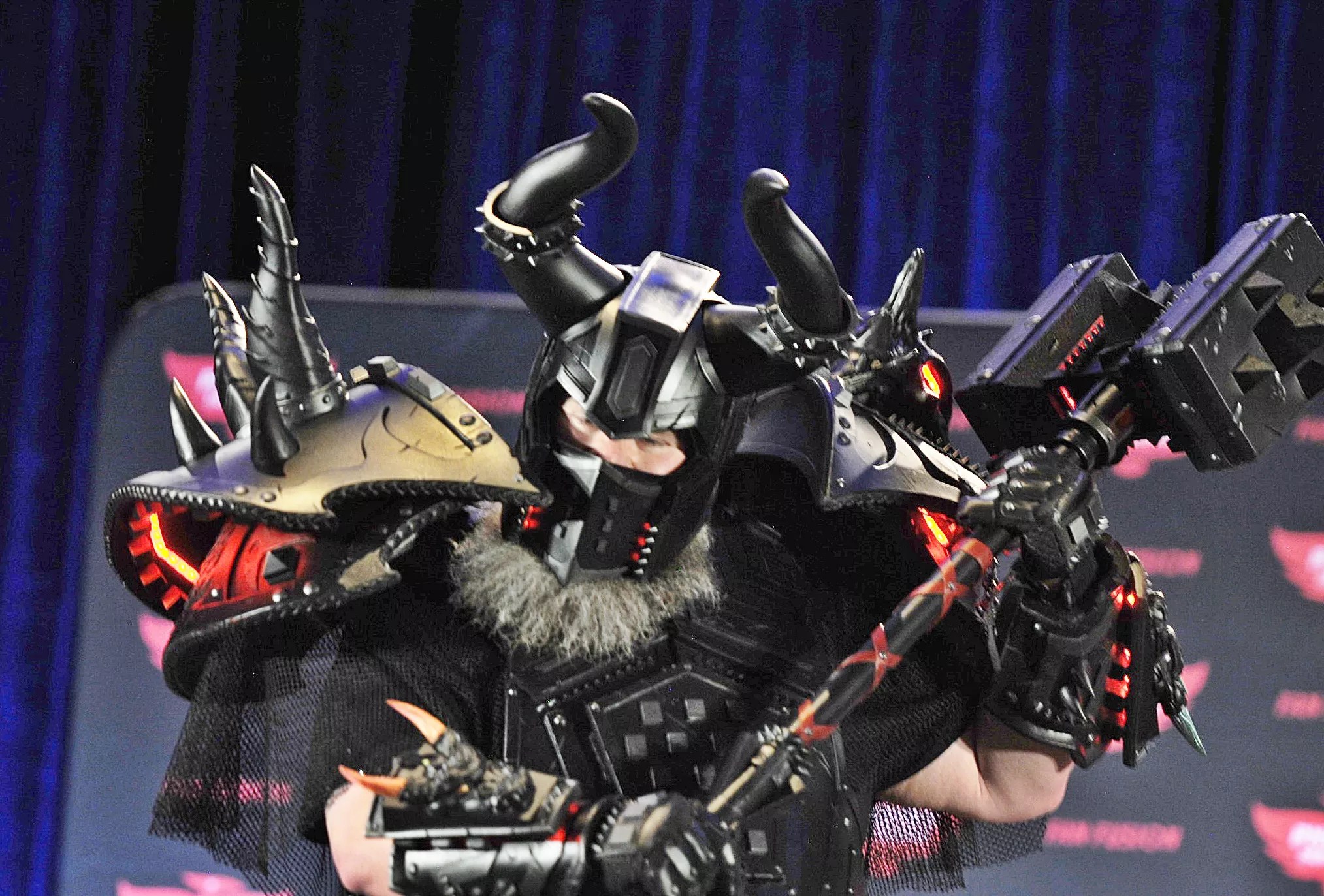 A local cosplayer shows off his “dwarf armor” during Fan Fusion’s cosplay masquerade.