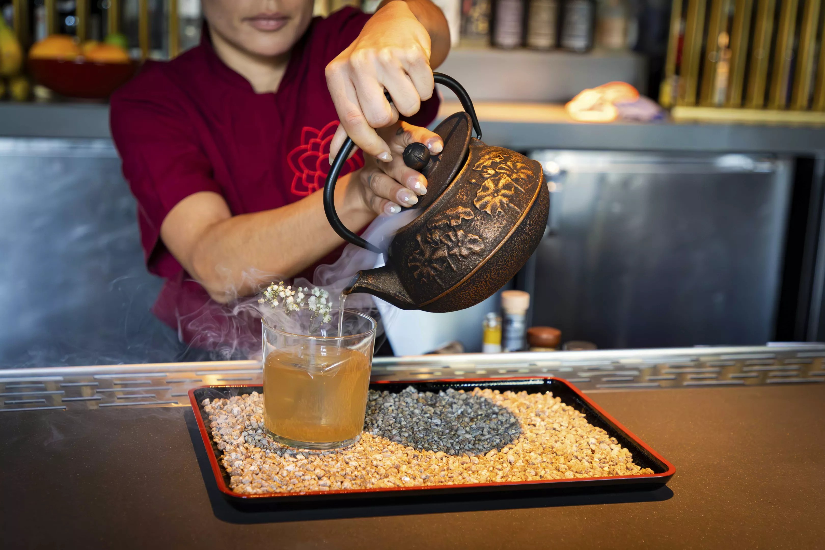 The Sympathizer is a blend of Akashi Whisky, genmaicha tea and toasted rice syrup. It’s smoked with cherry wood chips and served from a teapot tableside. The presentation resembles a zen garden.