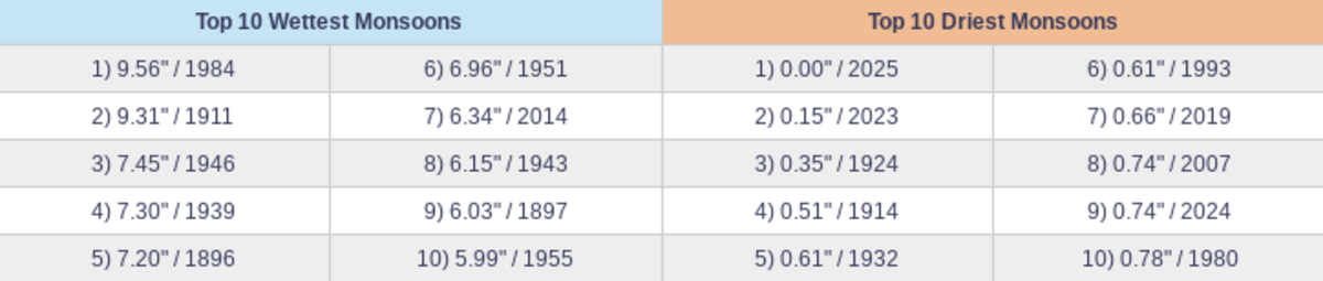 You may recall that Phoenix nearly set a record with a 159-day streak without measurable rain, bridging 2024 and 2025. Much of that fell outside of monsoon season, but we had a weak monsoon as well. Phoenix got only 0.74 inches of monsoon rain last year, the ninth-driest monsoon in Phoenix history. (Records go back to 1895.)
