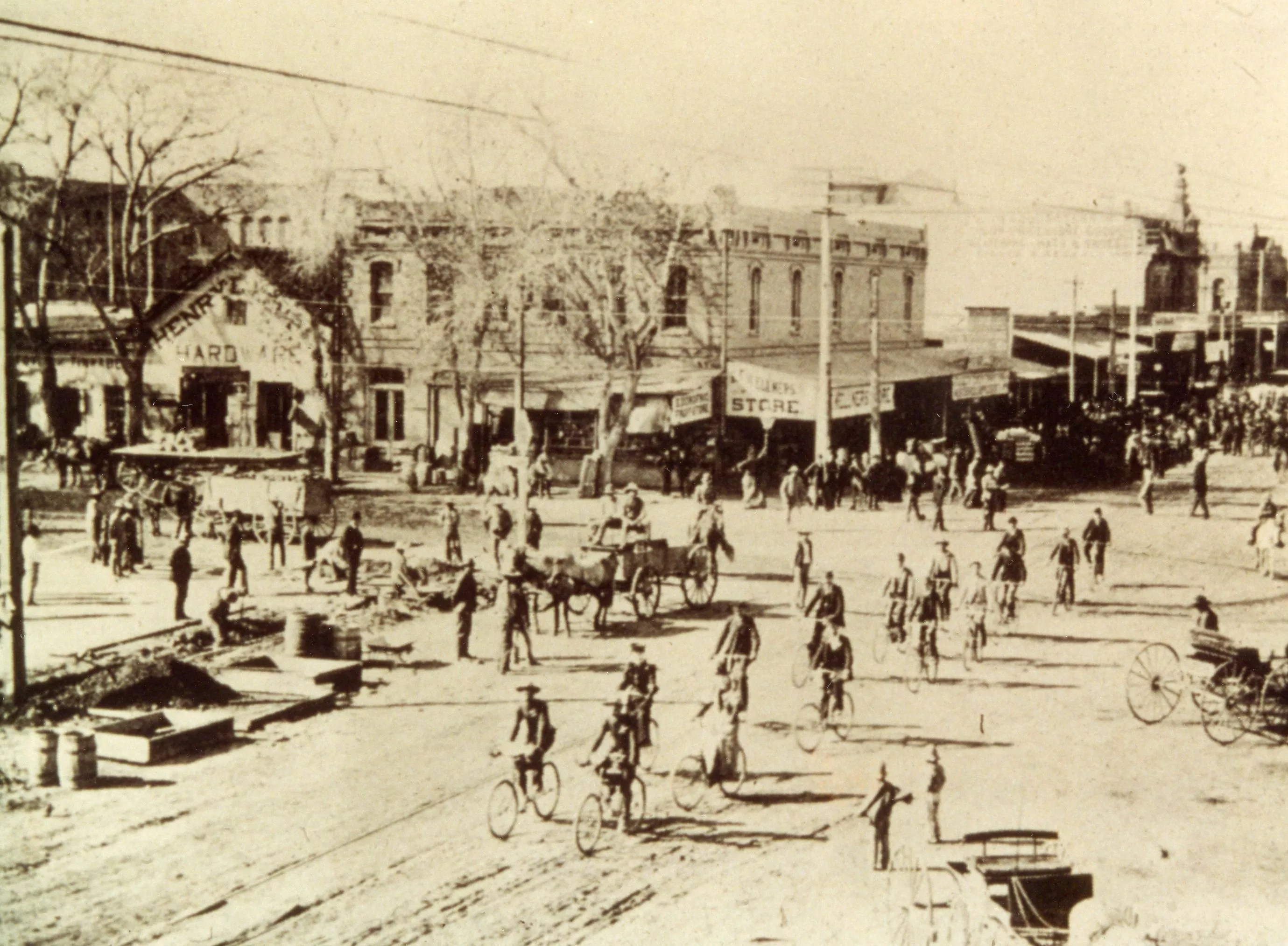 Nary a motor vehicle to be seen in this 1900s photo of a Phoenix street. Just bicycle riders and a horse-drawn carriage.