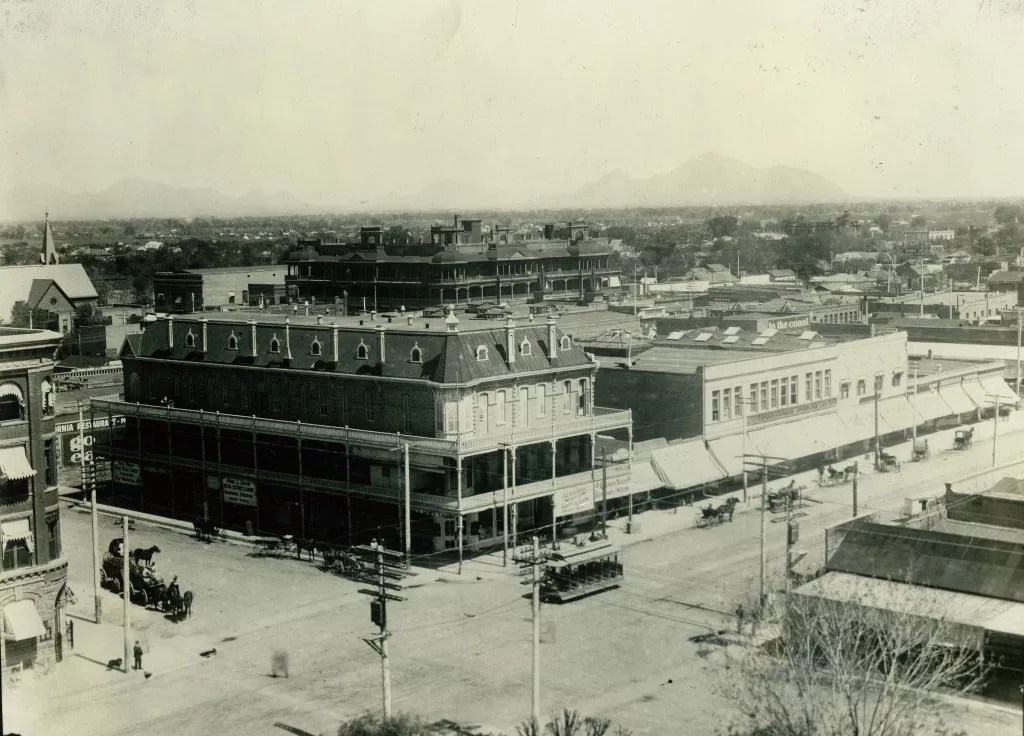 It’s not clear when this photo of the Monihon Building was taken, but it was built in 1889 on the northeast corner of First Avenue and Washington Street. It was constructed by James D. Monihon, an Arizona pioneer. That corner is now home to the Renaissance Square skyscraper.