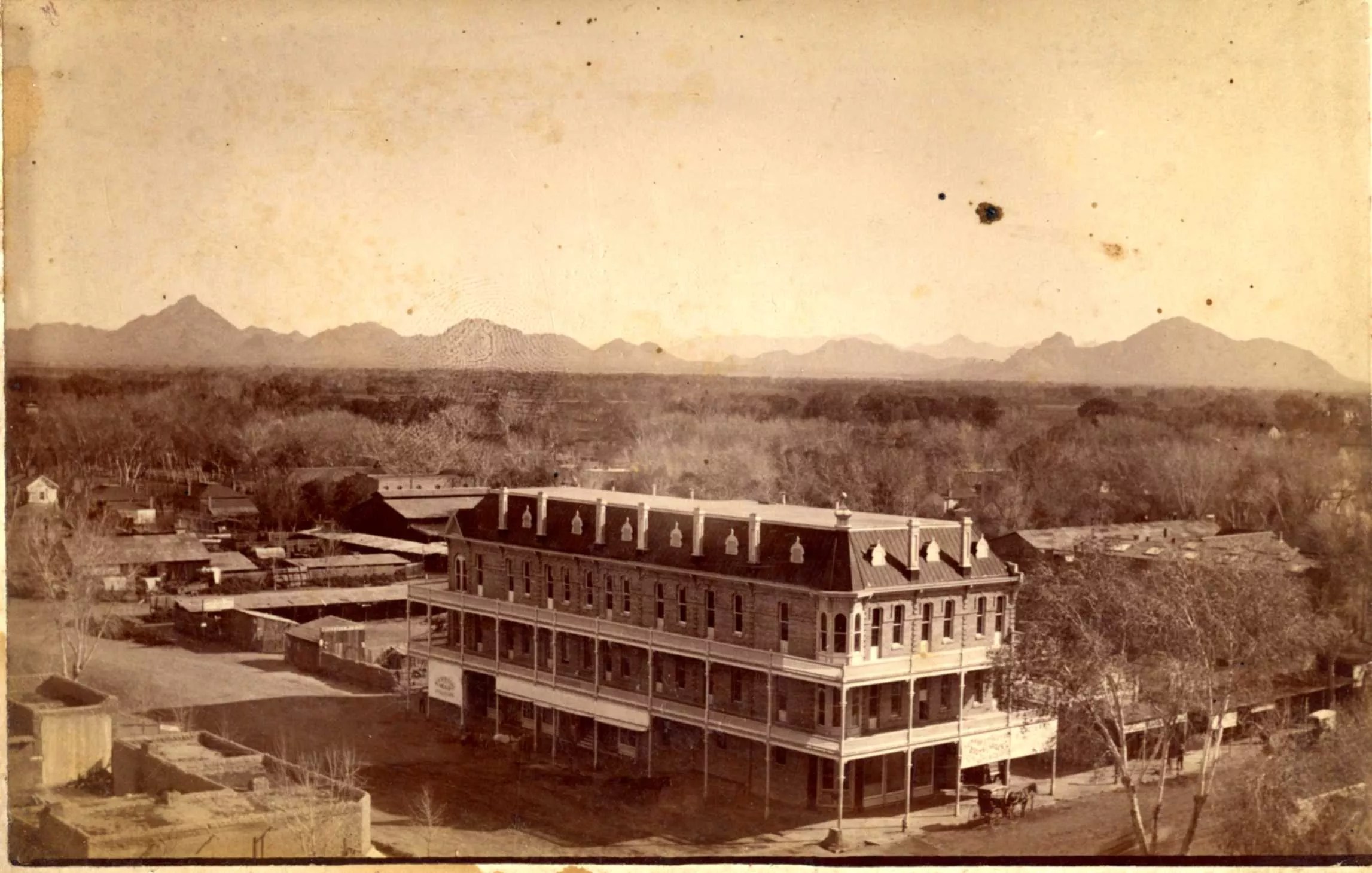 A lot has changed around the Monihon Building in this photo, taken sometime around 1900. More structures have risen around it, and a streetcar trolls along in front. But good ol’ Camelback Mountain sits unchanged in the distance.