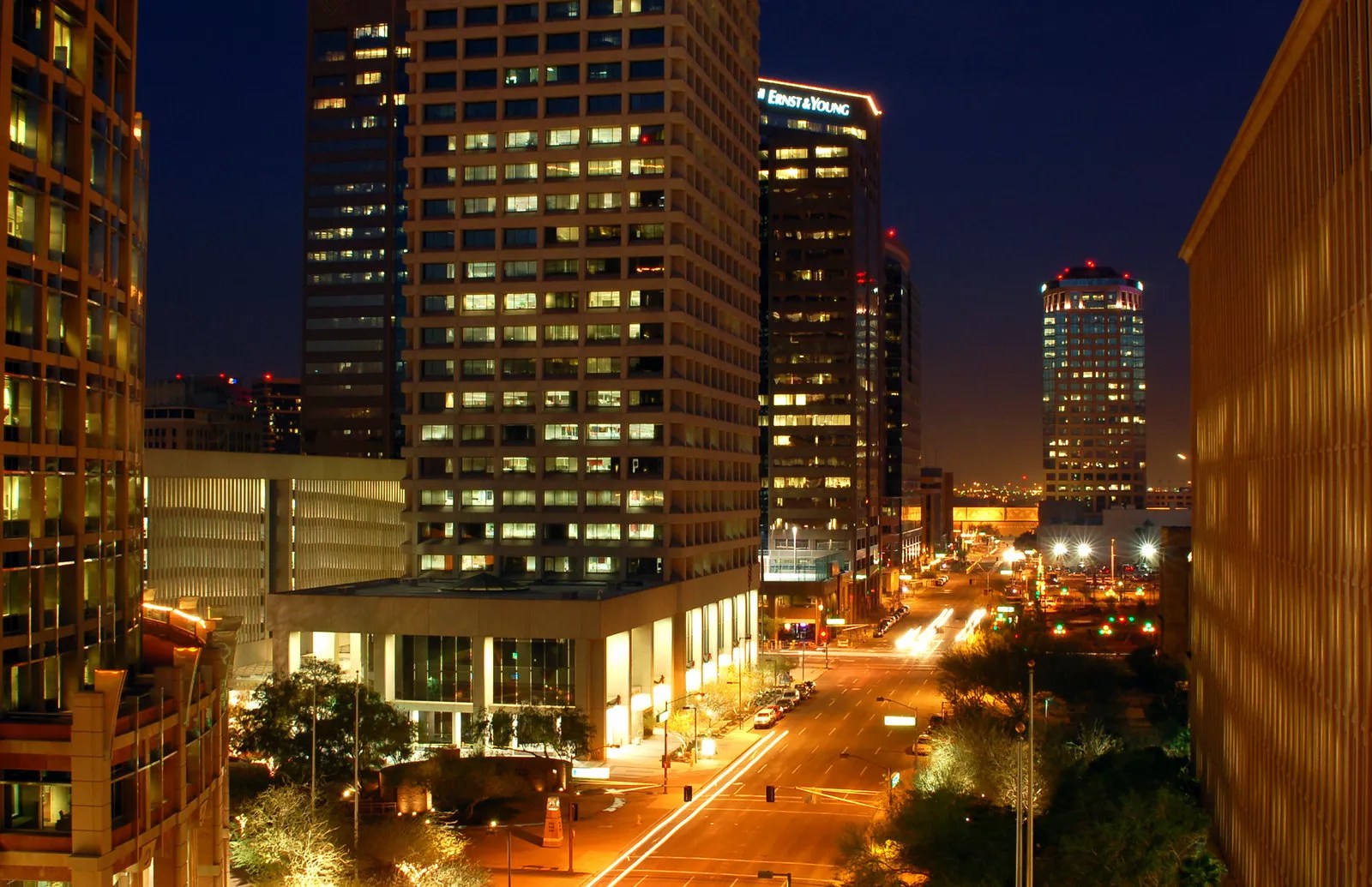 This 1933 photo offers glimpses of the Professional Building (to left of the smokestacks) and Luhrs Tower right next to that. Built in 1932 and located at 15 E. Monroe St., the Professional Building used to host Valley Bank and Trust, which later became Valley National Bank. You’ll see it again in these photos, with a prominent sign on top. It’s now a Hilton Garden Inn.