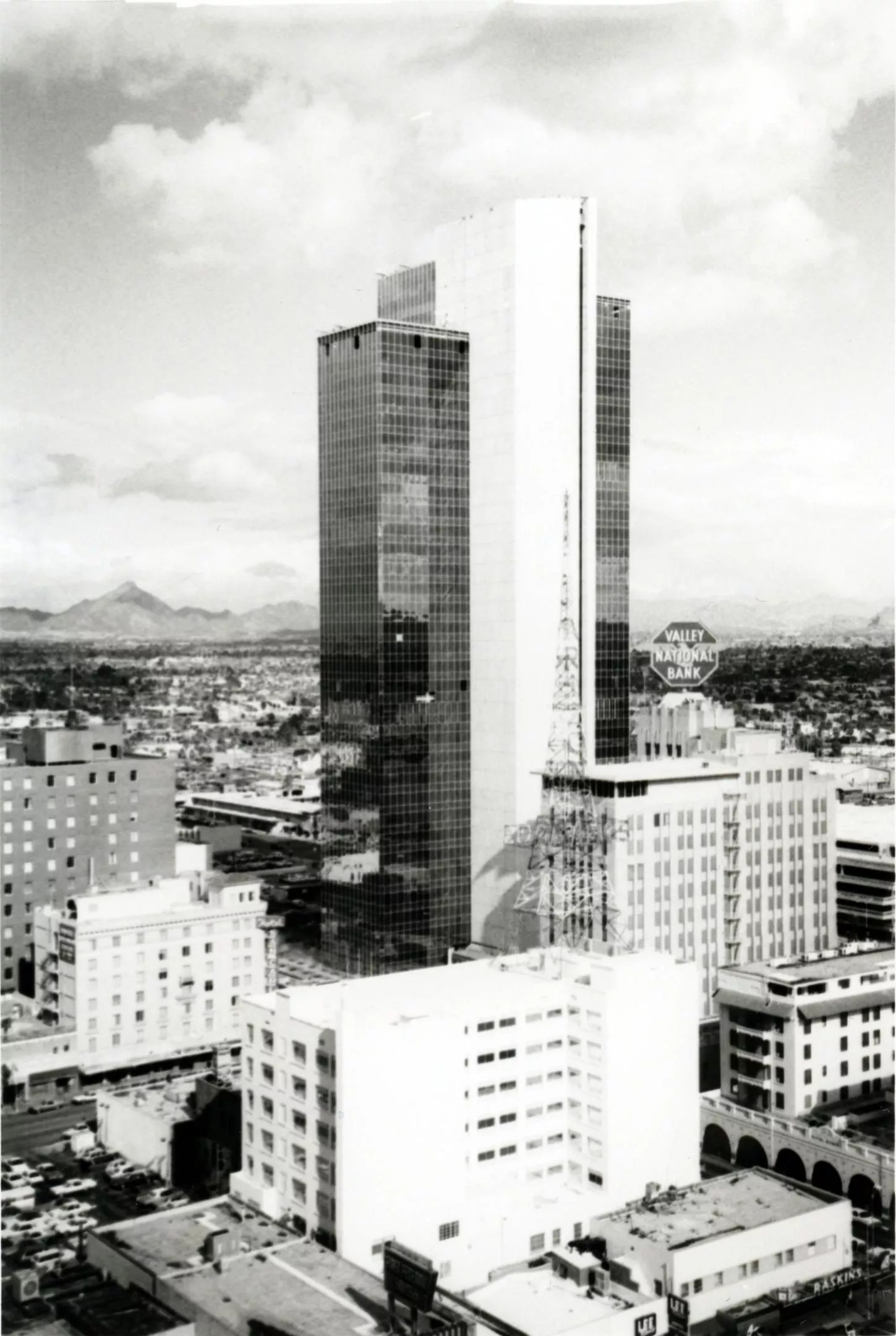 In this 1973 photo, you can see the Valley National Bank building – now with rotating sign – next to a brand-new glass facade tower constructed the year before. Initially owned by Valley National Bank, the structure was renamed Chase Tower – as we know it today – following a series of corporate takeovers and mergers.