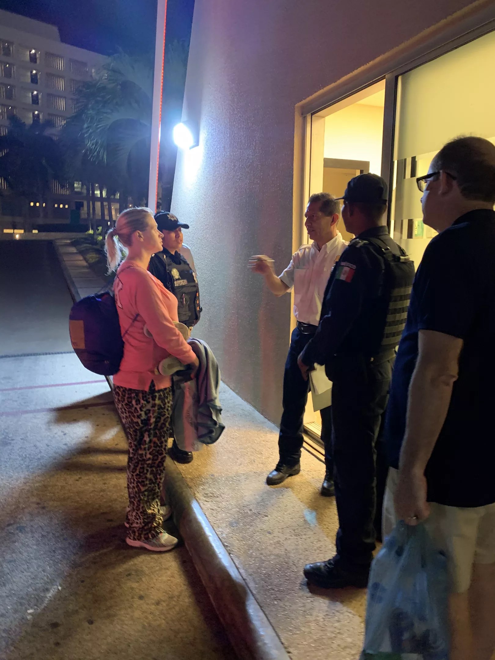 Emily Lopatofsky (left) speaking with police outside the hotel in Canc
