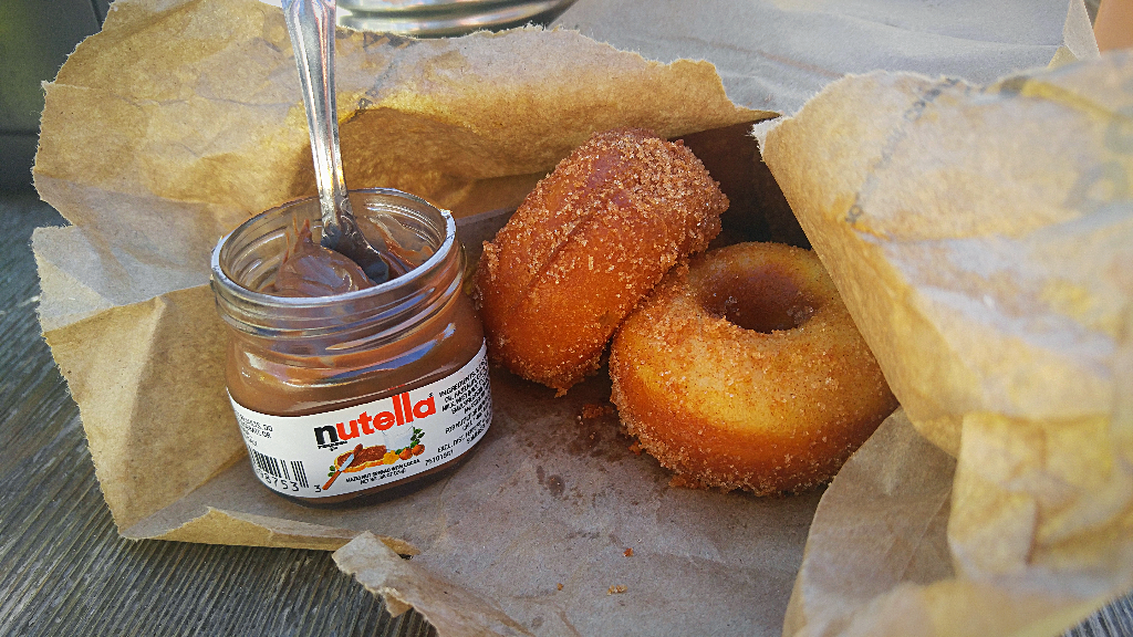 These doughnuts are both baked and deep-fried, with the slight heft of a cake doughnut, and the melty allure of a yeast doughnut. They are tossed with a blend of cinnamon and sugar inside the brown paper bag, and paired with a shrunken-down, .88-ounce jar of Nutella. Do these particular doughnuts need Nutella? Not really. They are lush and impeccably rich and sweet all on their own. But Nutella has become something like bacon. People like to put it on everything. Different strokes, and all that.