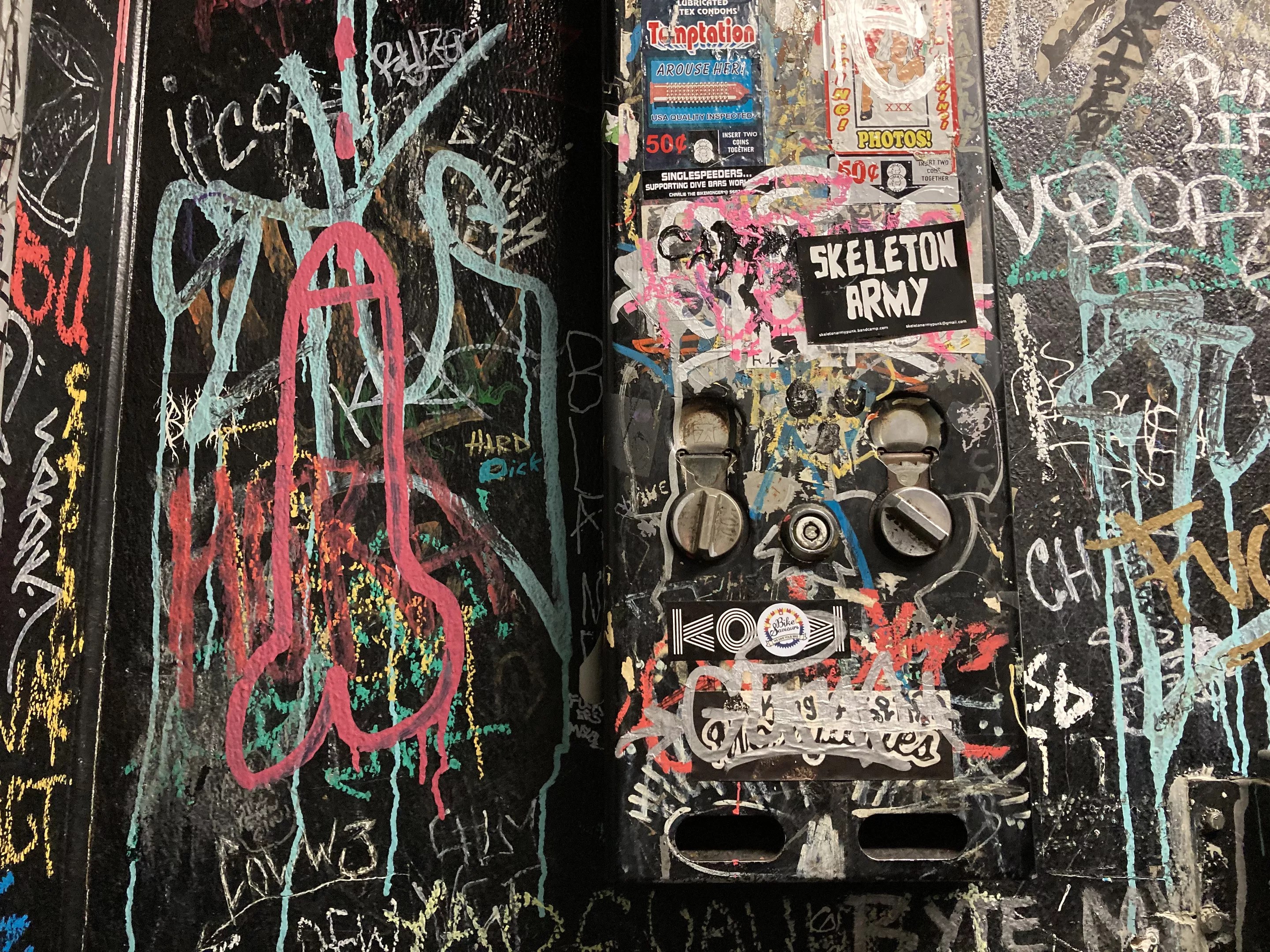 The 1984 cult sci-fi flick “Repo Man” turned 40 this year and marked the occasion in September with a deep dive into its landmark soundtrack and its collection of punk and wild, weird, underground rock. Curated by director Alex Cox with assistance from the members of Latino punk band The Plugz, the soundtrack was a snapshot of L.A.’s late ’70s/early ’80s punk rock scene with tunes from Iggy Pop, Suicidal Tendencies, Black Flag and Circle Jerks. No wonder we called it one of the greatest movie soundtracks ever made. The restroom walls of infamous Tempe dive Palo Verde Lounge. Lauren Cusimano
