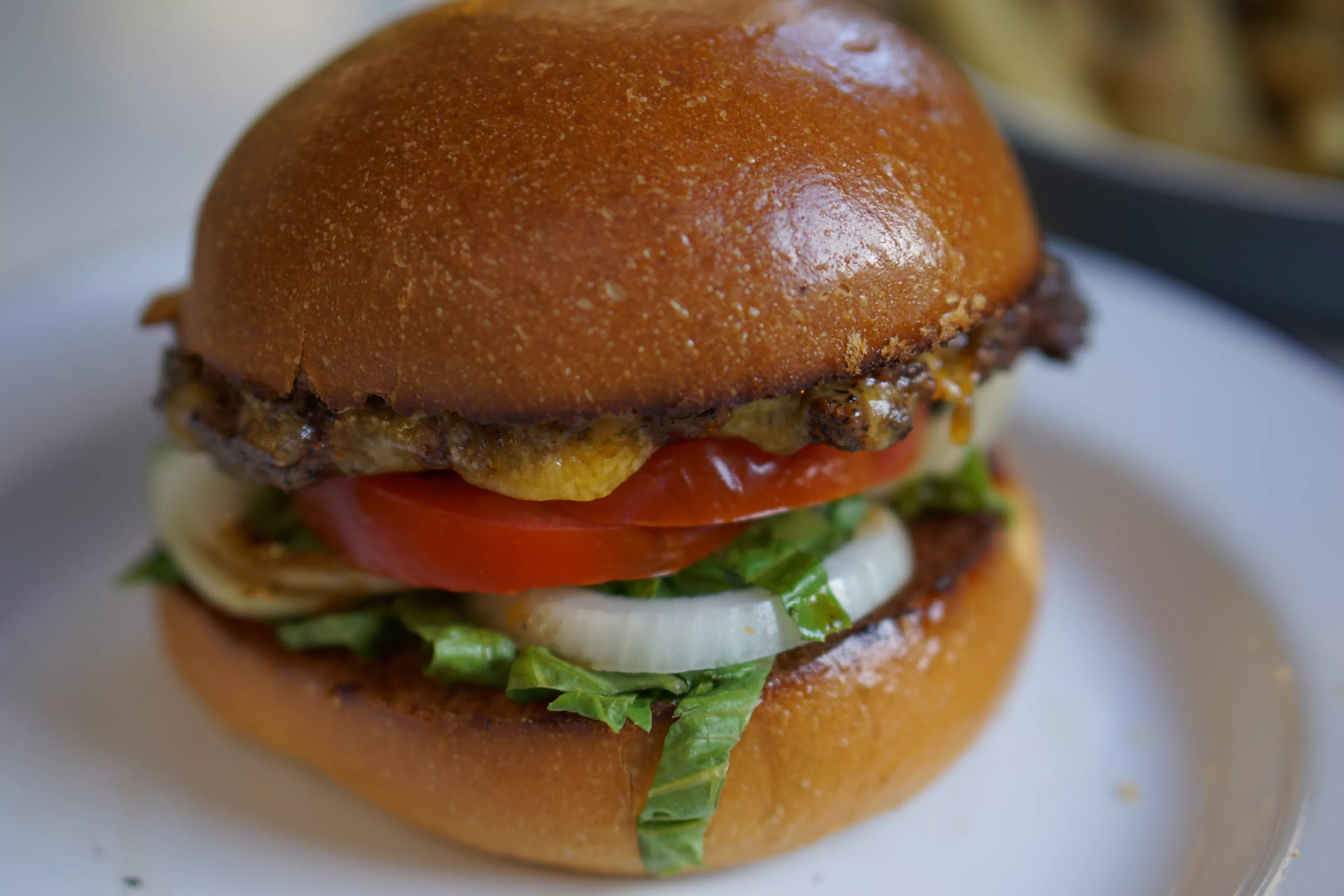 The classic burger at Handcut Burgers and Chophouse comes with lettuce, onions, and cheese. (We asked for tomatoes because we’re traditionalists like that.)