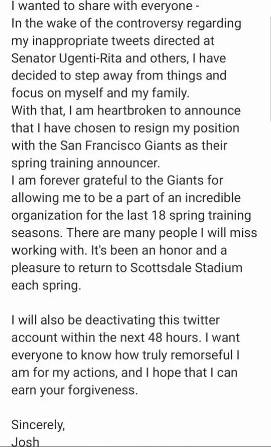 Miller – who has narrated San Francisco Giants spring training games over the public address system since 2003 and whose resume also includes work with Grand Canyon University, the Arizona Fall League, and Scottsdale’s Desert Mountain High School – had been making posts like these since at least November. He regularly quote-tweeted Ugenti-Rita from an anonymous account called ZonaJosh, mixing political rhetoric with misogynistic attacks, calling her a “whore,” a “bitch,” and a “twat.”
