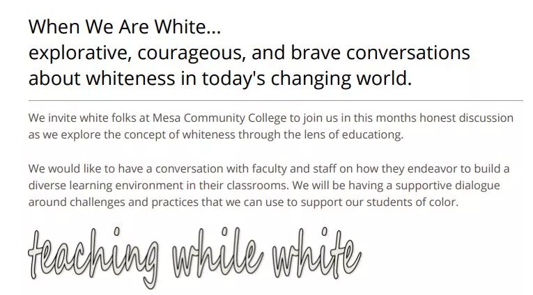 “We invite white folks at Mesa Community College to join us in this months [sic] honest discussion as we explore the concept of whiteness through the lens of educationg, [sic],” reads an invitation on MCC’s Intranet, a network for district faculty and staff. “We would like to have a conversation with faculty and staff on how they endeavor to build a diverse learning environment in their classrooms. We will be having a supportive dialogue around challenges and practices that we can use to support our students of color.”