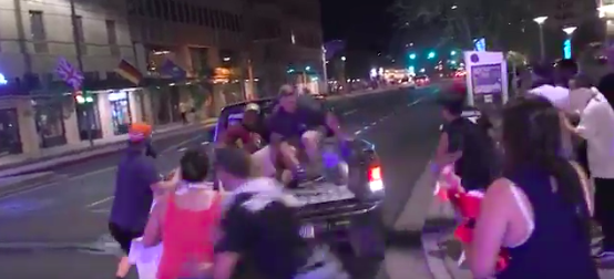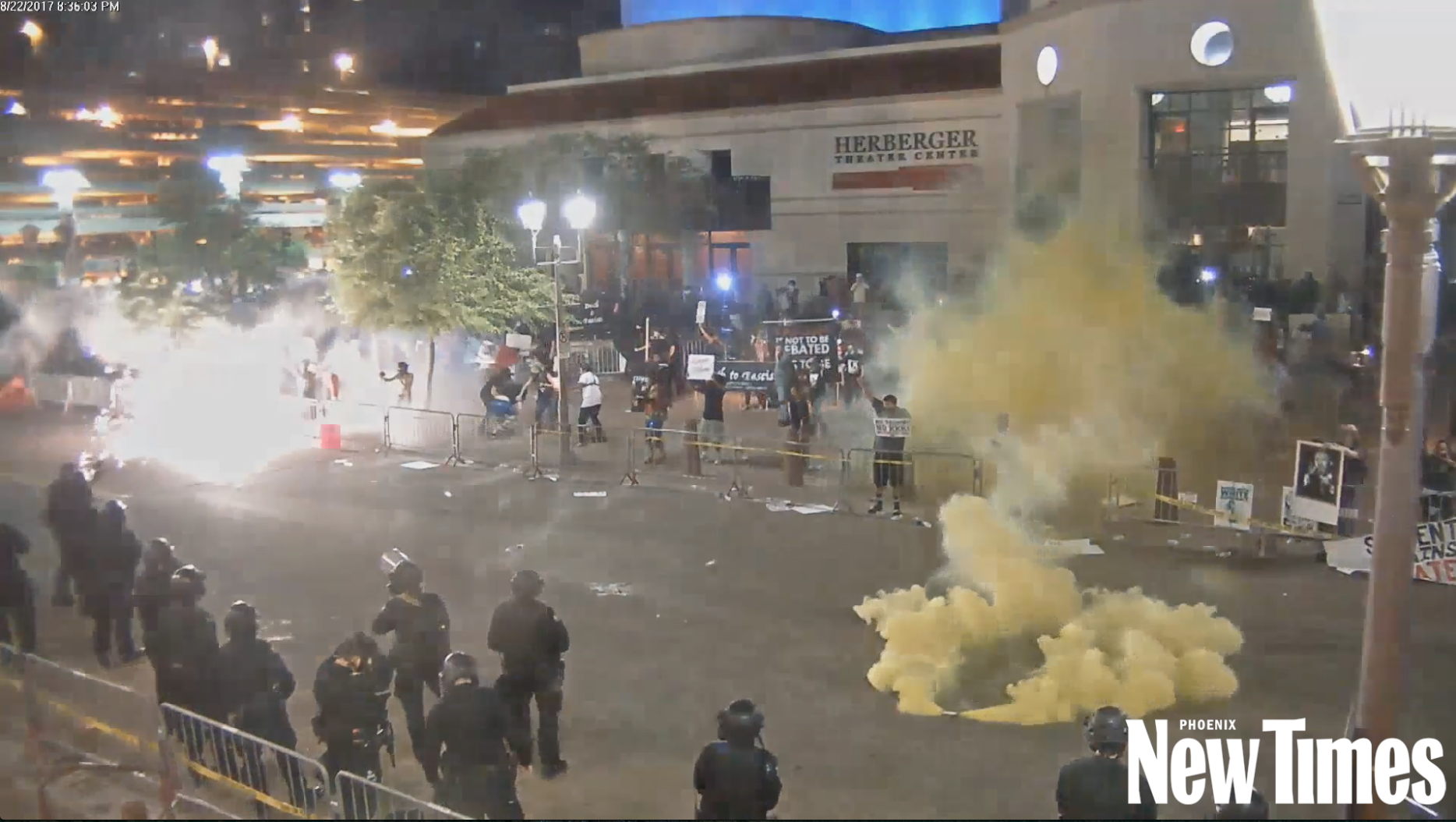 The official version goes like this. The Phoenix Police Department said a small knot of anti-Trump protesters clumped in front of the Herberger Theater Center on Monroe Street threw bottles and gas canisters at a line of officers. Those officers issued verbal warnings, donned gas masks, and fired successive volleys of pepper-spray balls, inert smoke bombs, and tear gas. The crowd quickly fled as quickly as the trouble began. There were no reports of injuries.
