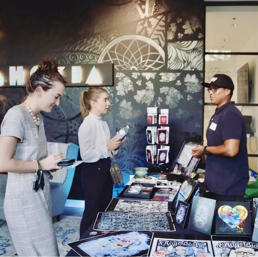 By the black collaborative wall art sits a table with merchandise for sale. The space opens to the left. Indigenous artists’ works hang on the walls. A painting of Frida Kahlo rests on an easel.