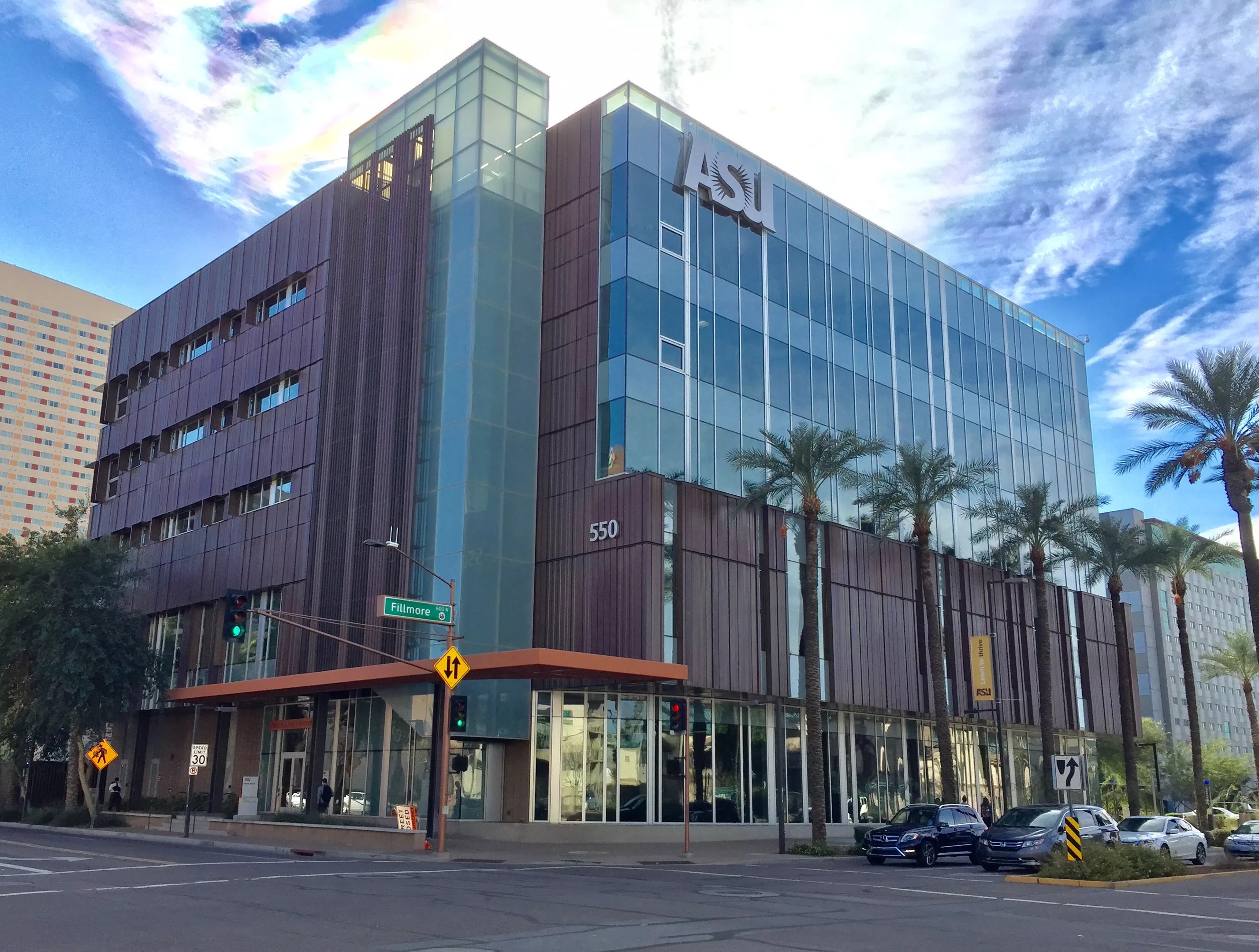 Built for the rapidly expanding ASU downtown Phoenix campus in 2009, this Gold LEED-certified building is fitted with a copper skin for shade and was designed with special attention to passive solar design, recyclable materials, and energy and water efficiency. The building’s 11 awards include an Award of Merit for Environmental Excellence from the Valley Forward Association, a Citation Award from the American Institute of Architects and a 2011 North American Copper in Architecture Award. The copper panels of the 84,000-square-foot building alternate three profiles in a randomly repeating pattern to create texture and a play of light and shadow. Perforations in the panels provide air movement and shading, while a glass curtain wall on the north side distributes natural light. The building, designed by SmithGroup JJR, houses learning and research facilities for 3,000 students. For more information about the college, visit the ASU College of Nursing and Health Innovation website.
