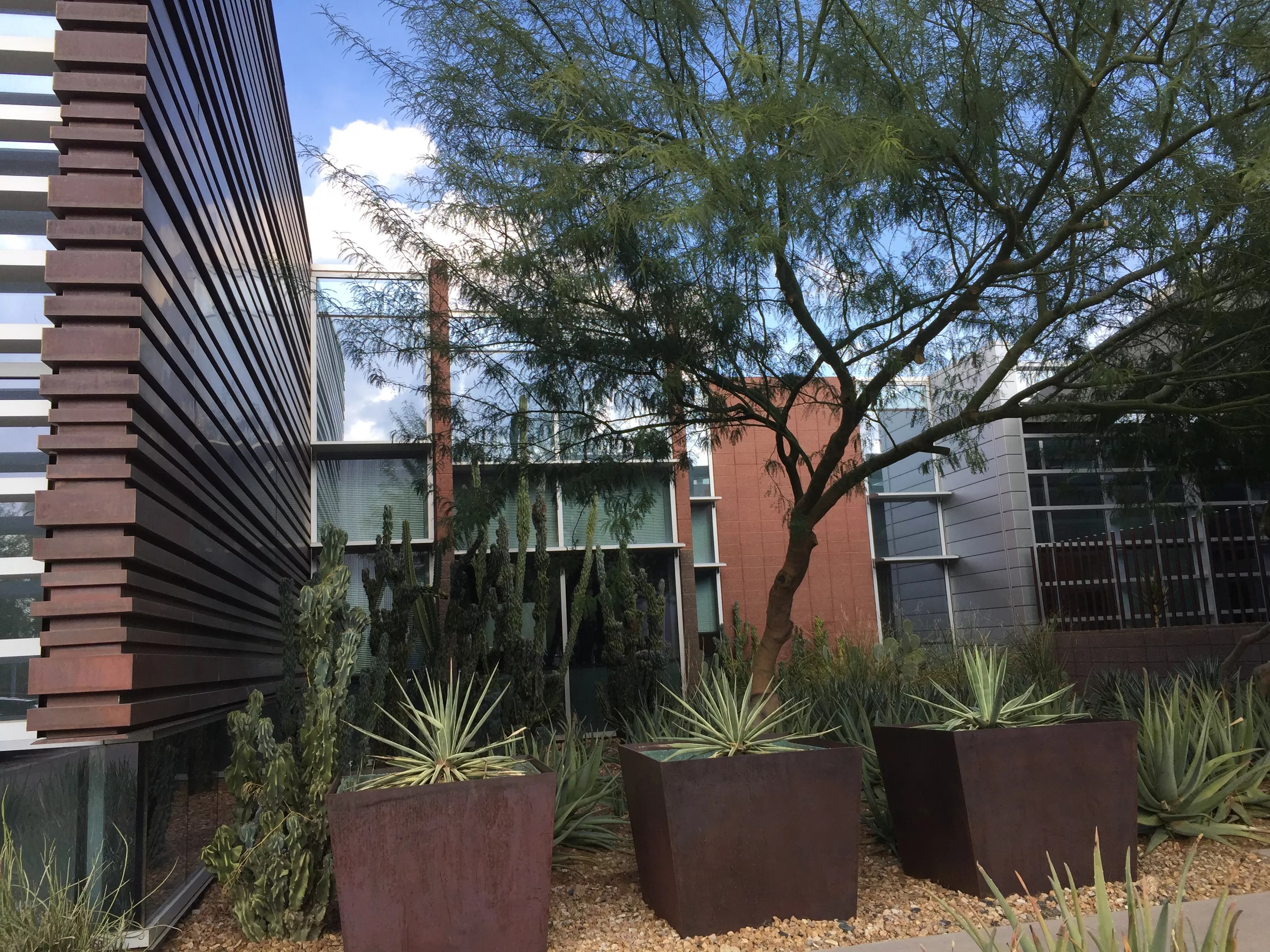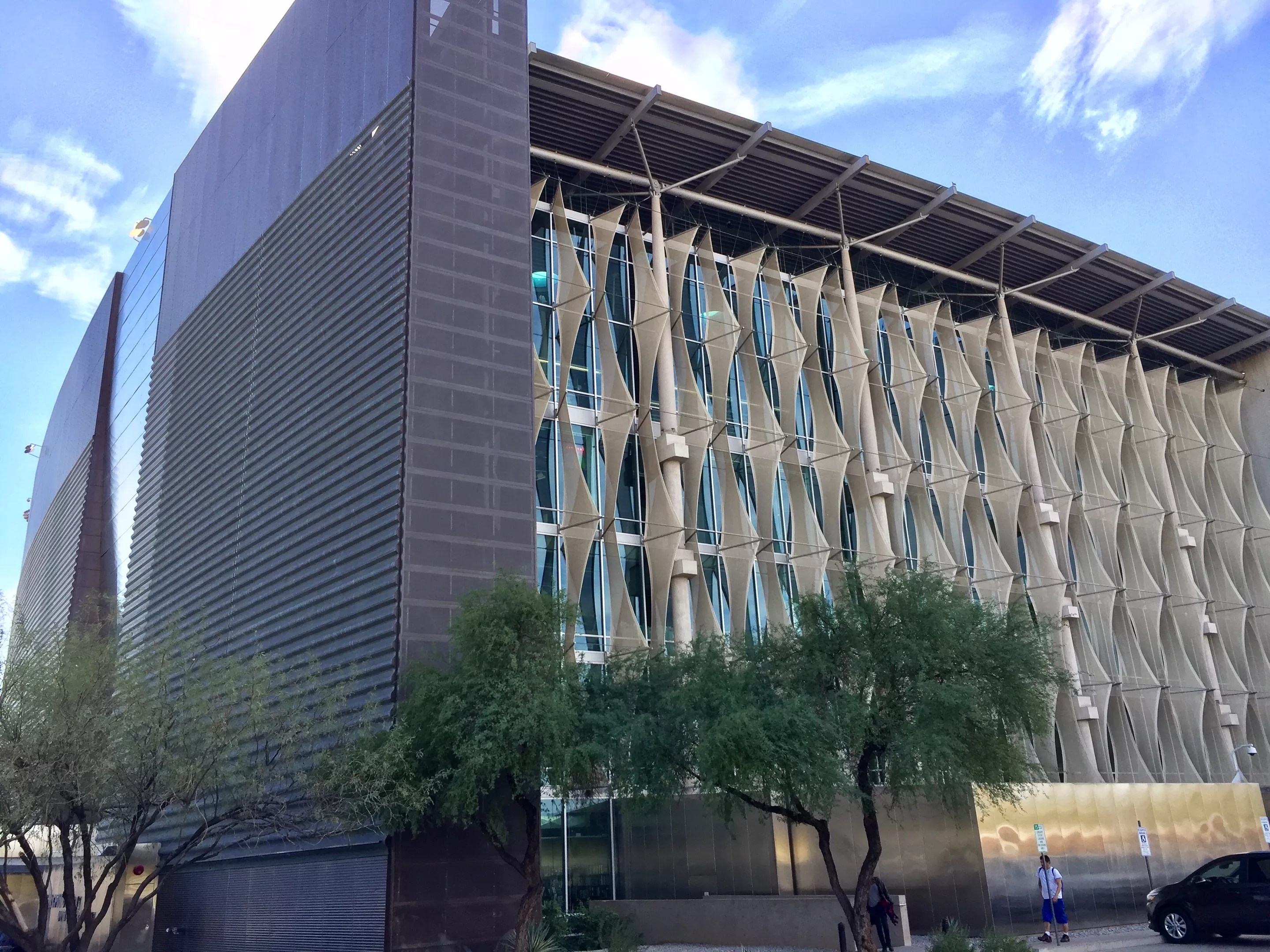 Three different textures of copper skins protect ASU’s College of Nursing and Health Innovation from the elements.