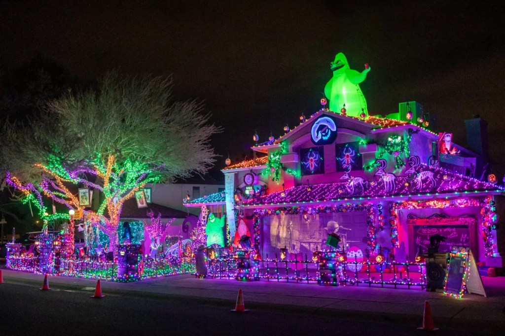 Not every must-see Halloween house is built for heart-pounding scares. This north Phoenix display blends a glow-in-the-dark graveyard with Disney-style whimsy like a 12-foot Jack Skellington. Weekends include singing and special Halloween effects. Details: 6 to 10 p.m., nightly from Oct. 13 to 31. Free. 3302 W. Adobe Dam Road.