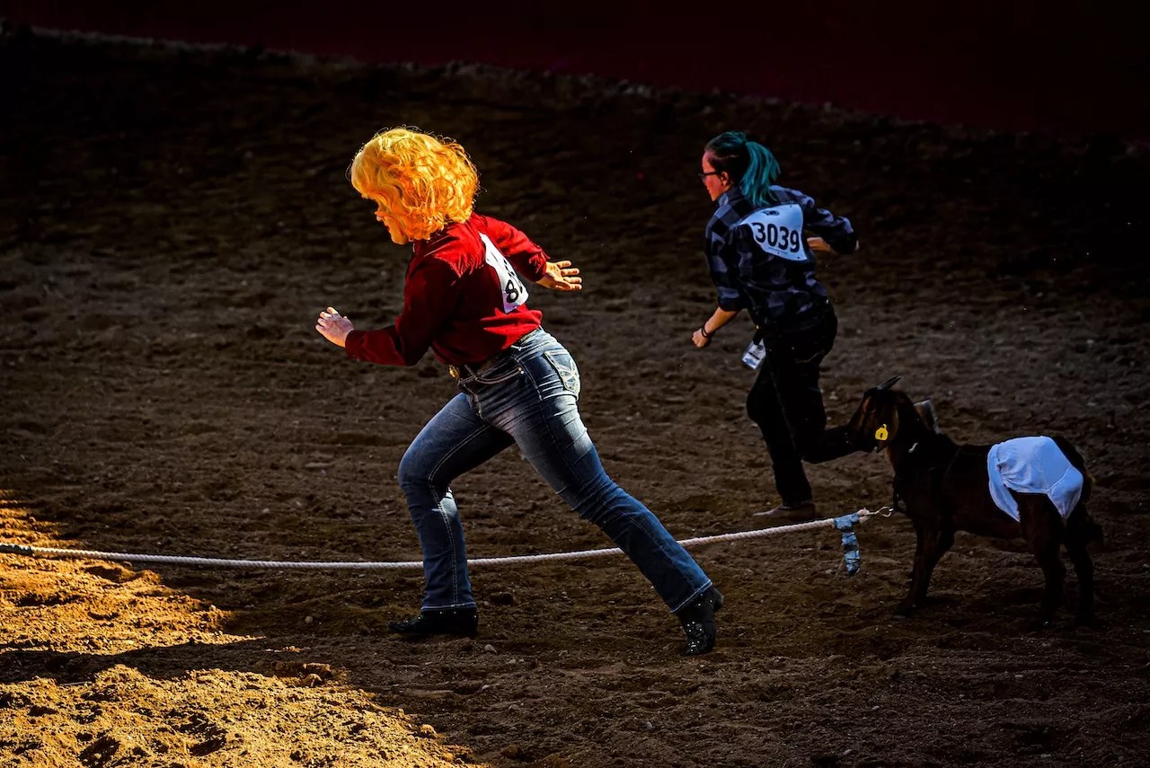 Evita Peroxide and her goat dressing partner run to the finish line during the goat dressing event on Sunday.