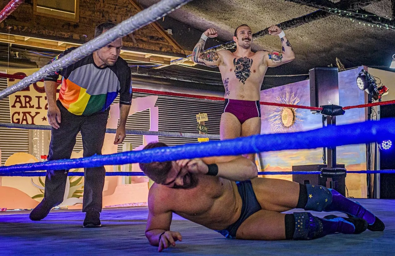 A wrestler flexes while his opponent lies on the mat during a Wrestle Drag match.