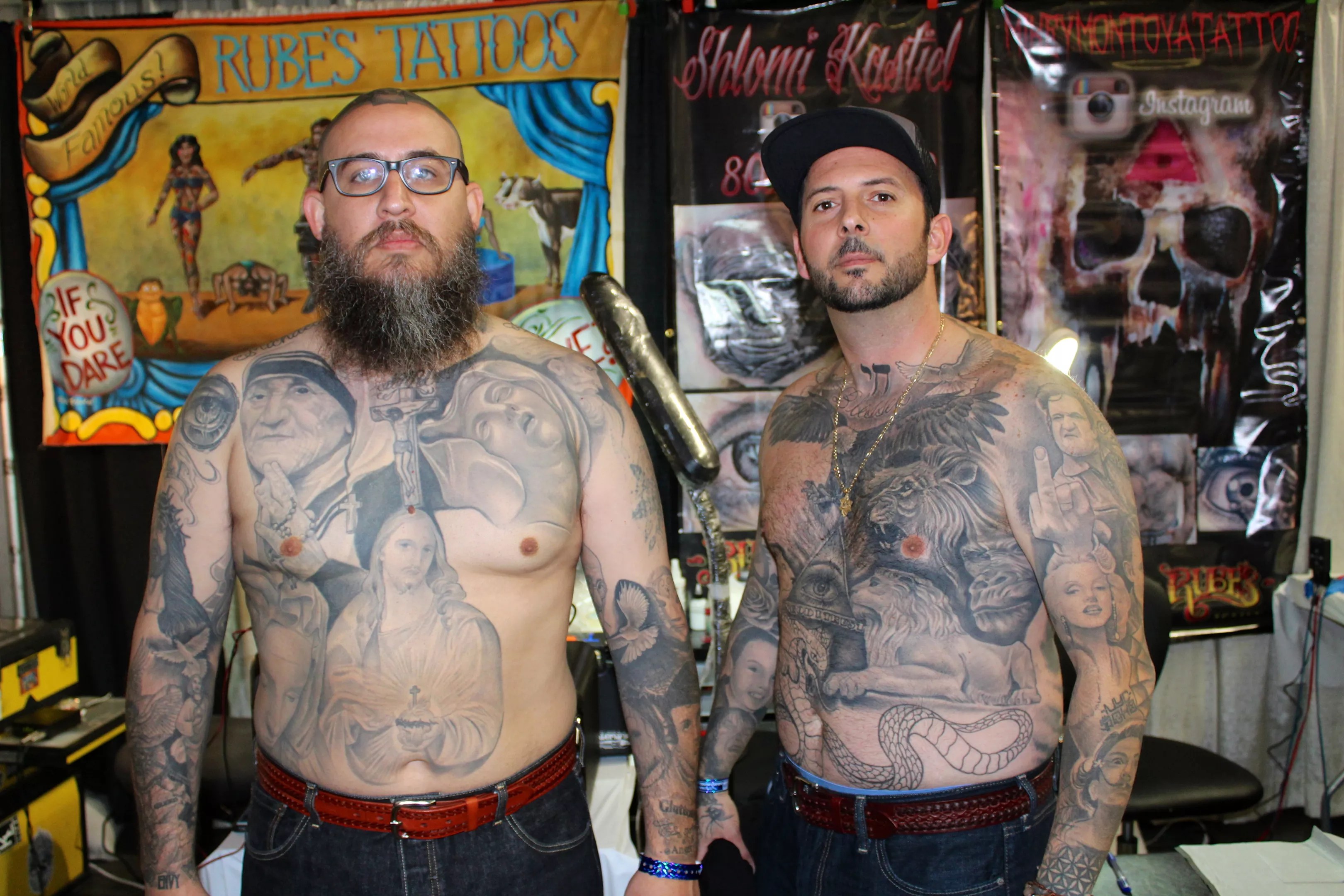 Juice, left, and Shlomi Kastiel of Rube’s Tattoo in Arcadia, California, show off their black and white portraits done by coworker Mikey Montoya.