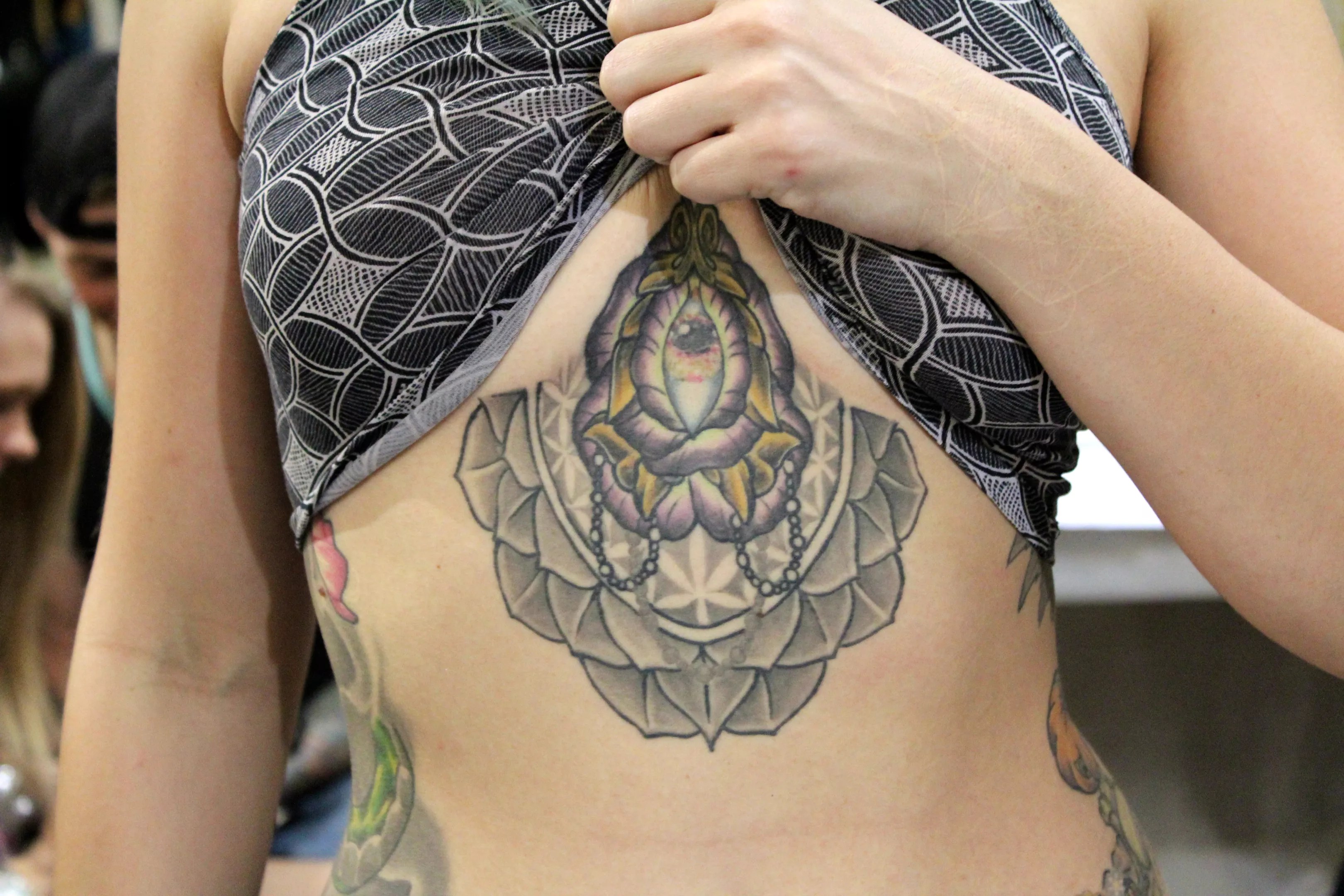 There are some places on the body that produce more pain when a needle is continuously jabbed into it than others. The area between one’s chest and abdomen, we imagine, is one of them. The underbust tattoo is a permanent corset of sorts, with the final presentation accentuating an area often overlooked when considering tattoo placement. The underbust area itself is more popular than a particular style. Edges of such a tattoos were seen sneaking out from under halter tops at the Body Expo, and included geometric or filigree-esque line work.