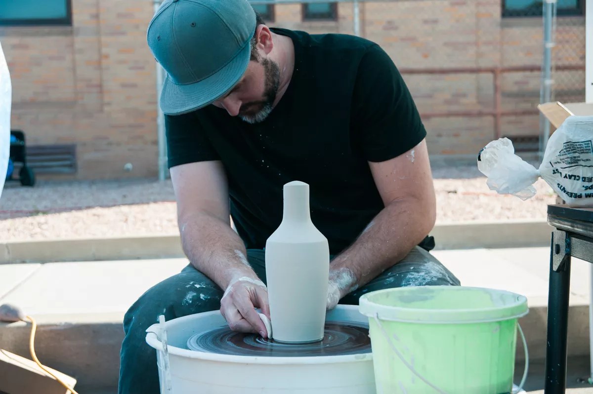 A man slowly spins a bit of ceramic at Southwest Maker Fest in downtown Mesa.