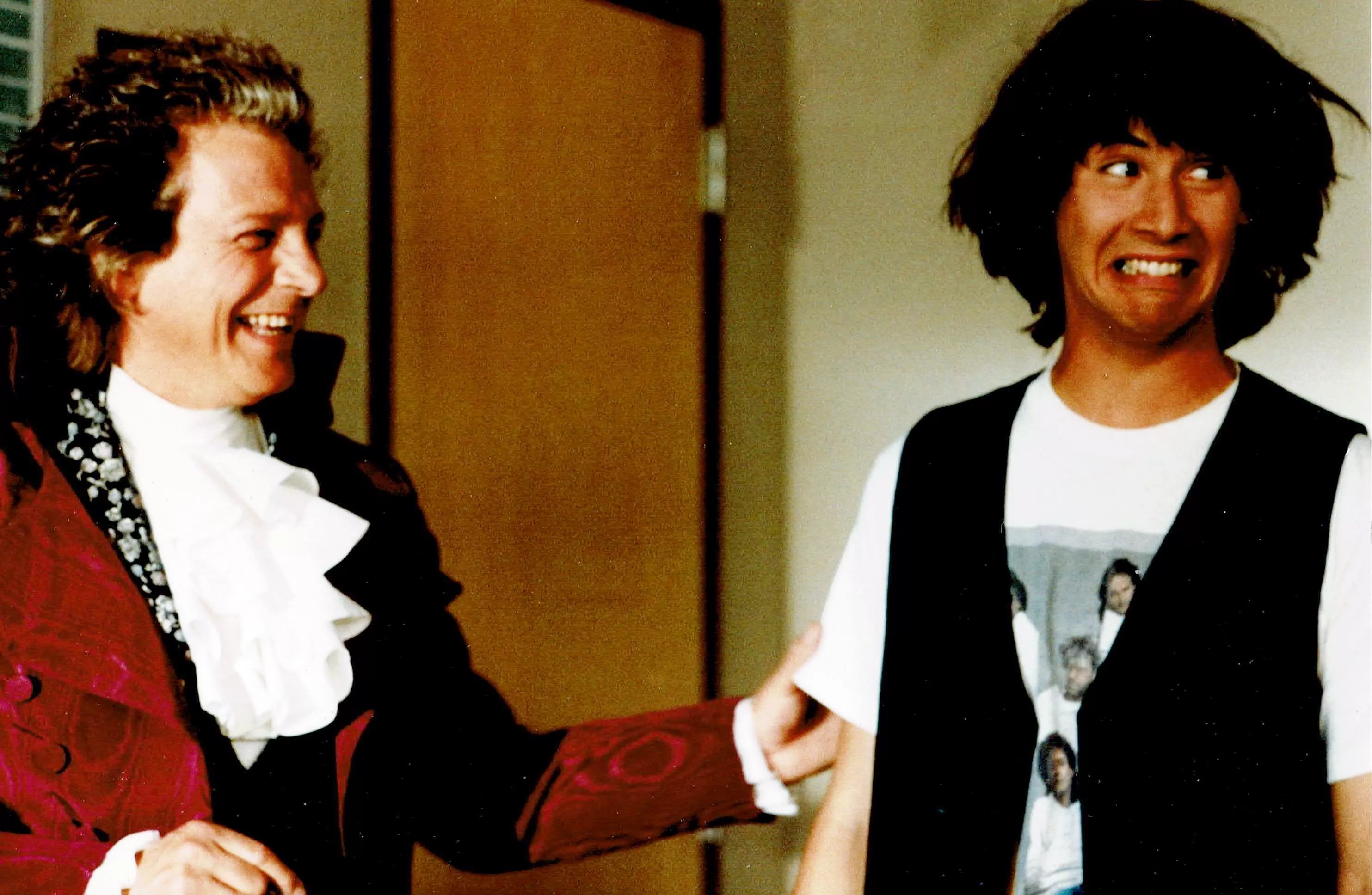 Keanu Reeves (right) with Beethoven actor Clifford David (left) in a deleted scene from “Bill & Ted’s Excellent Adventure” that was filmed at the now-demolished East High School in Phoenix.