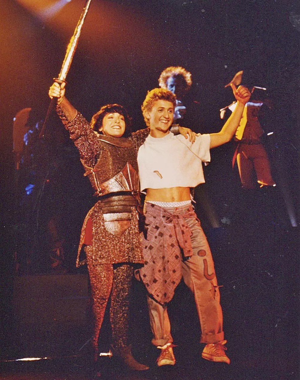 Joan of Arc actress and former Go-Go’s guitarist Jane Wiedlin (center) with crew members from “Bill & Ted’s Excellent Adventure.”