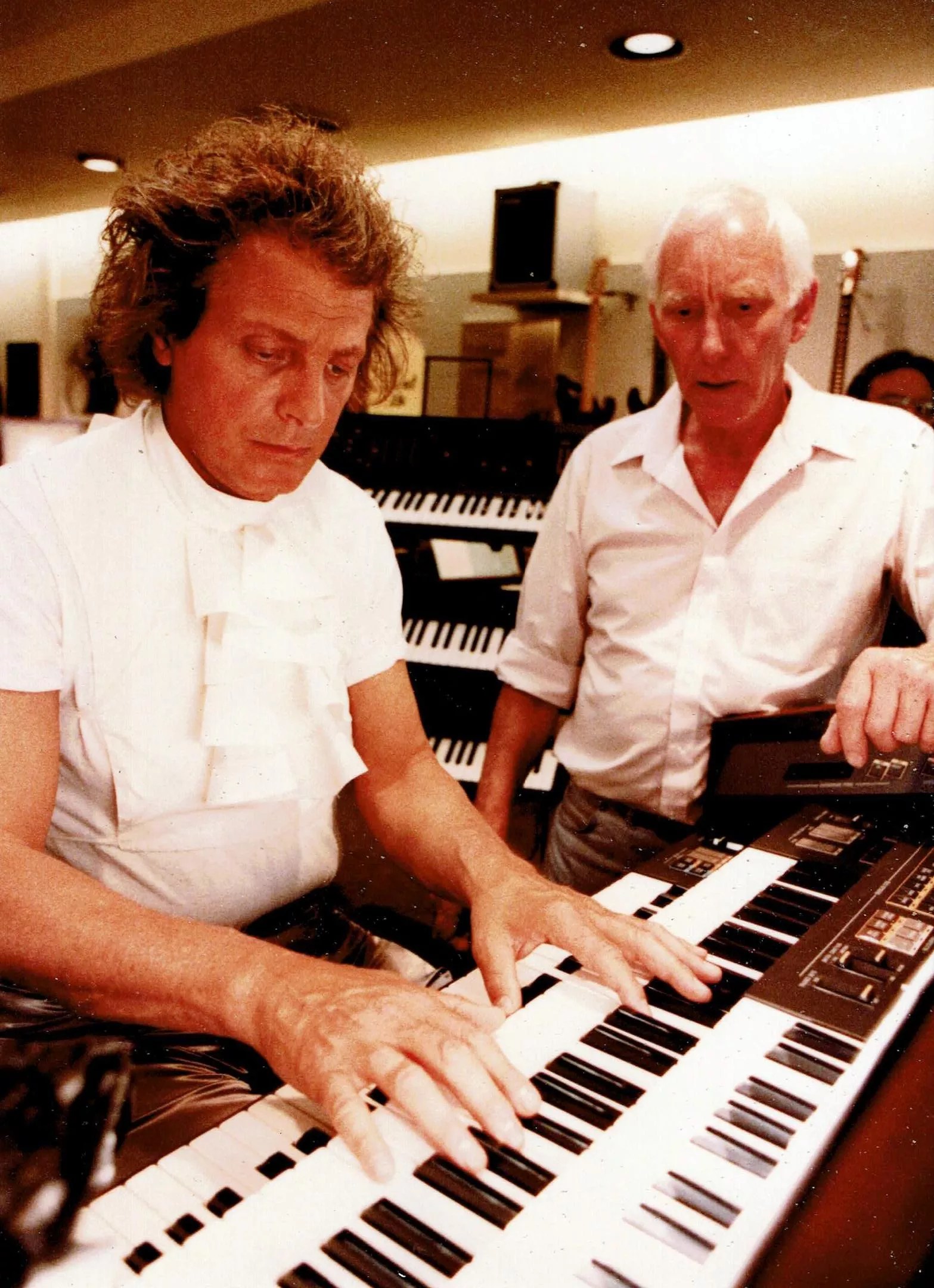Beethoven actor Clifford David (left) with the late Roy Forge Smith, the production designer for “Bill & Ted’s Excellent Adventure,” during filming at now-defunct mall Metrocenter in Phoenix.
