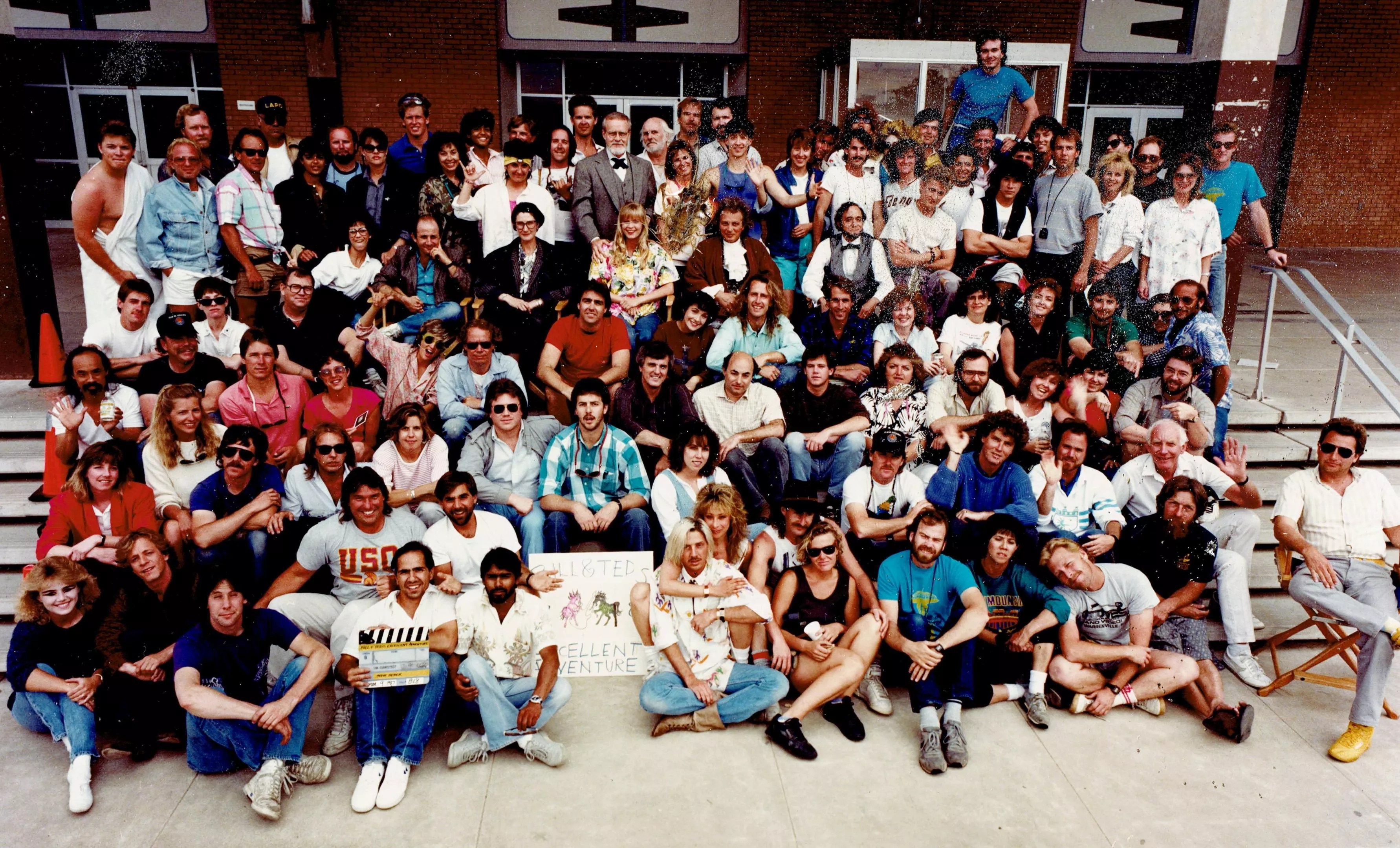 A group photo of the cast and crew of “Bill & Ted’s Excellent Adventure” at the now-demolished East High School in Phoenix.