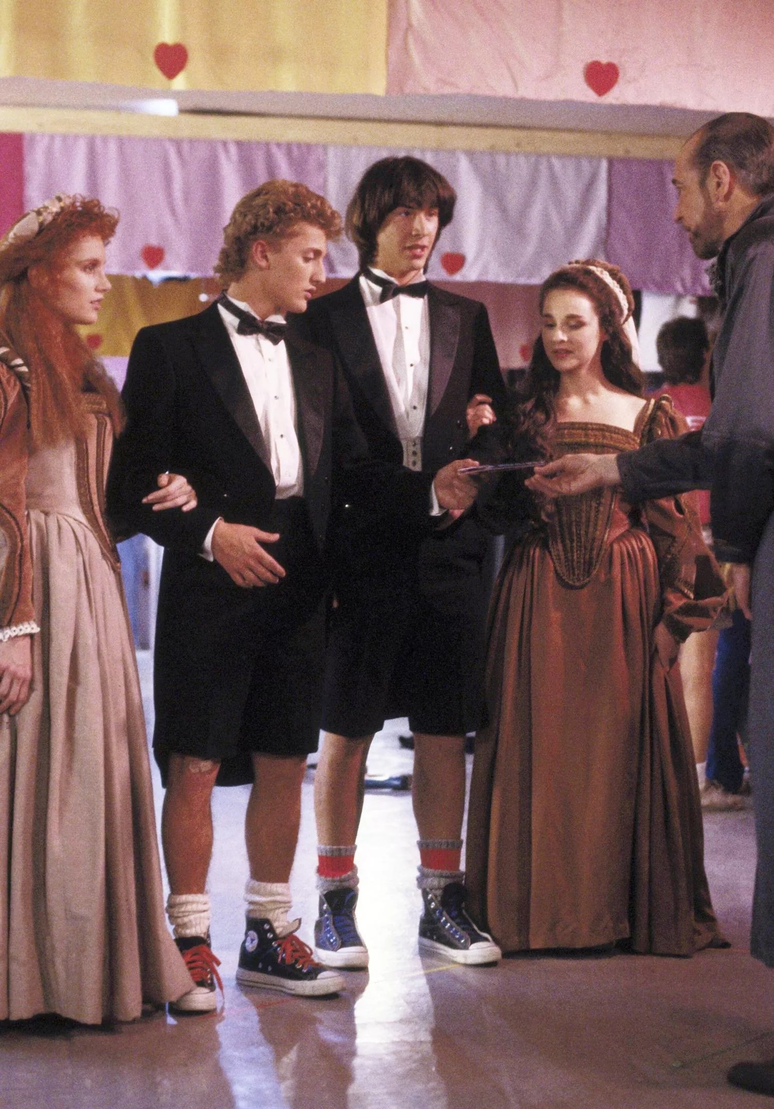 Alex Winter (center left) and Keanu Reeves (center right) with actress Kimberley Kates (far left) and Diane Franklin during a prom scene filmed at East High School in Phoenix that was cut from “Bill & Ted’s Excellent Adventure.”