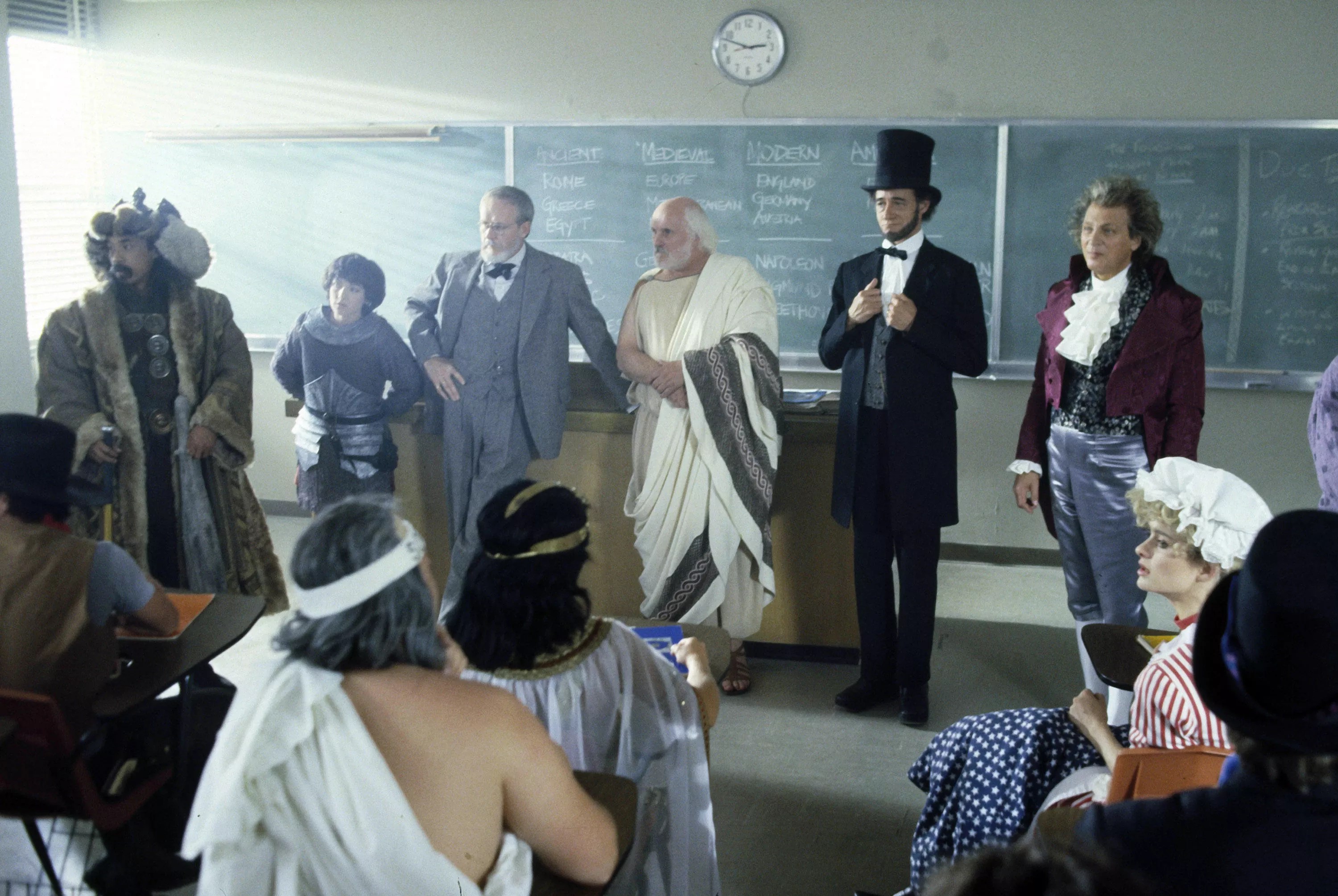 Historical figures from “Bill & Ted’s Excellent Adventure” (from left): Al Leong as Genghis Khan, Jane Wiedlin as Joan of Arc, Rod Loomis as Sigmund Freud, Tony Steedman as Socrates, Robert V. Barron as Abraham Lincoln and Clifford David as Ludwig van Beethoven during a scene filmed at East High School in Phoenix that was cut from the movie.