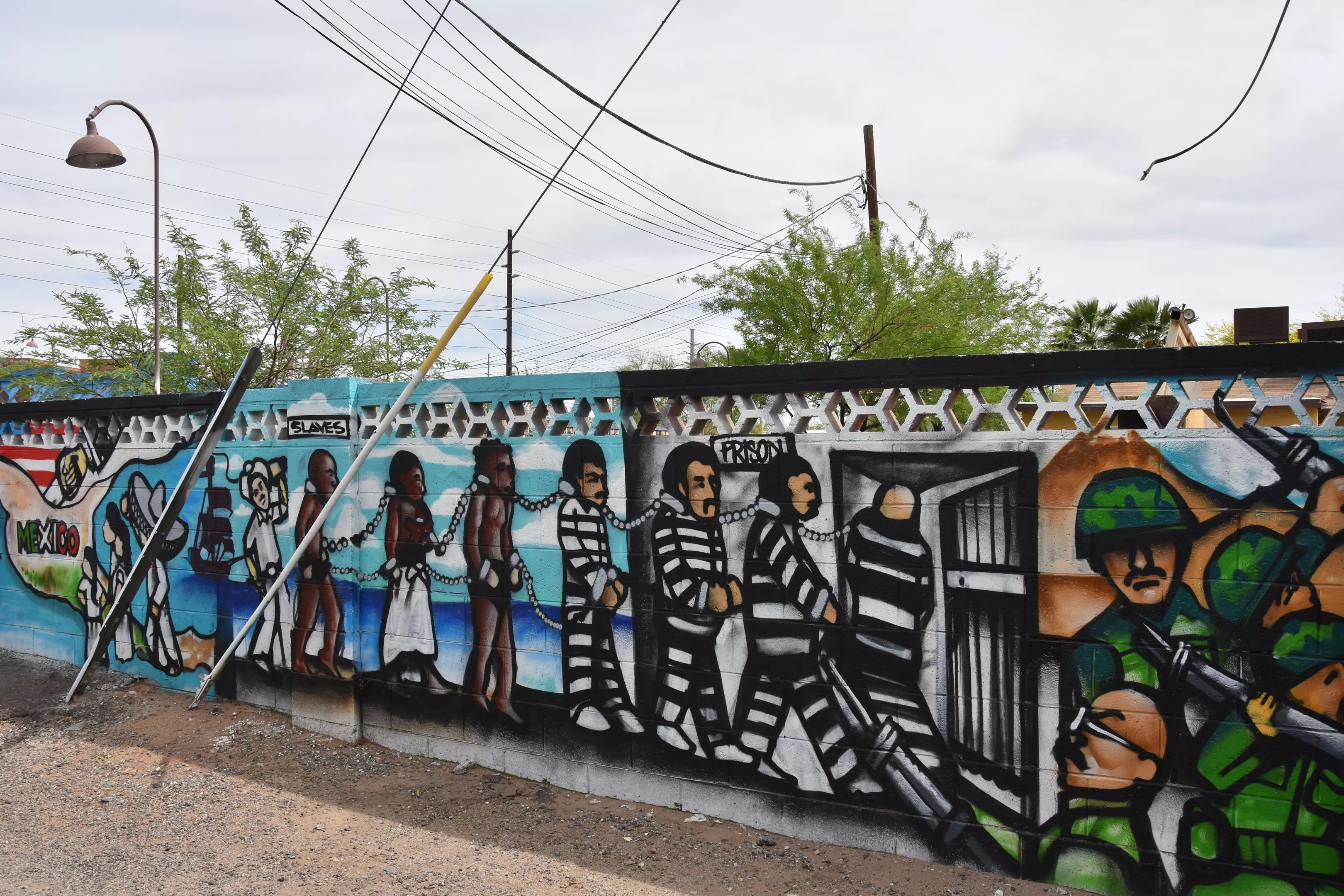 The defaced mural is one of many painted by Diaz throughout downtown Phoenix. His most political offering is a long mural painted on a brick wall off an alleyway behind Barrio Café on 16th Street. That one tackles immigration, incarceration, and other social justice themes.