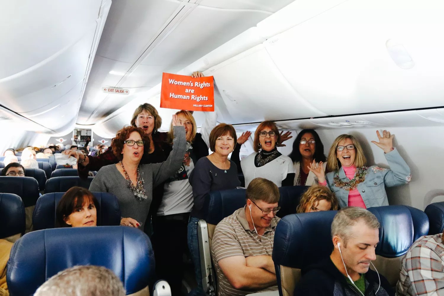 Despite the two sides being clearly divided, there was an undeniable excitement in the air. The group of women with signs packed in their carry-ons was the biggest generator of it.