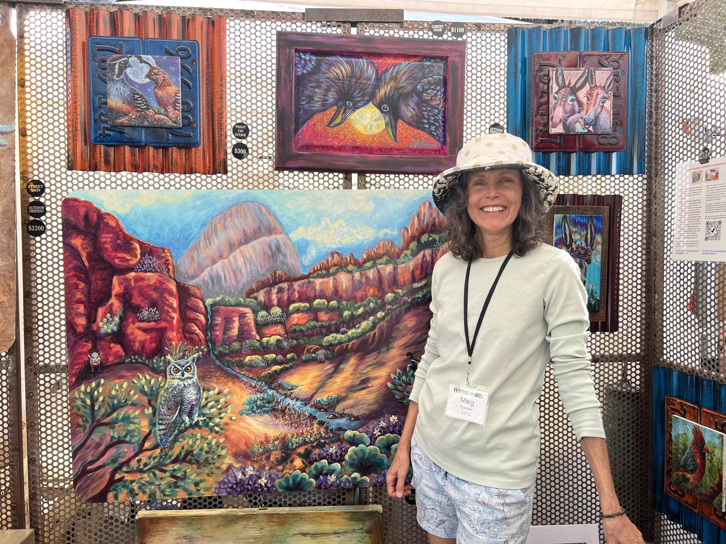 Local artist Meg Harper stands with her bright, cheerful paintings of animals.