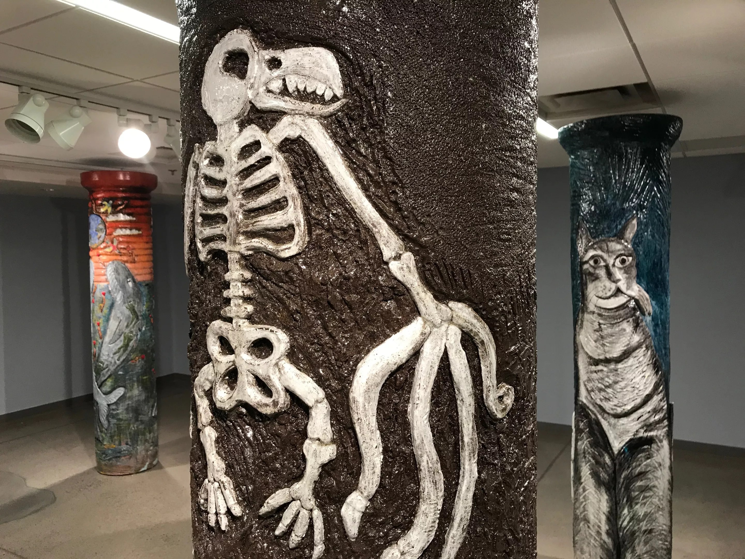 The most interesting piece, titled Dinosaur Bones, depicts fossils lodged in the earth. A row of shoes circles the column near the top, prompting viewers to reflect on what lies beneath as they traverse modern-day sidewalks.