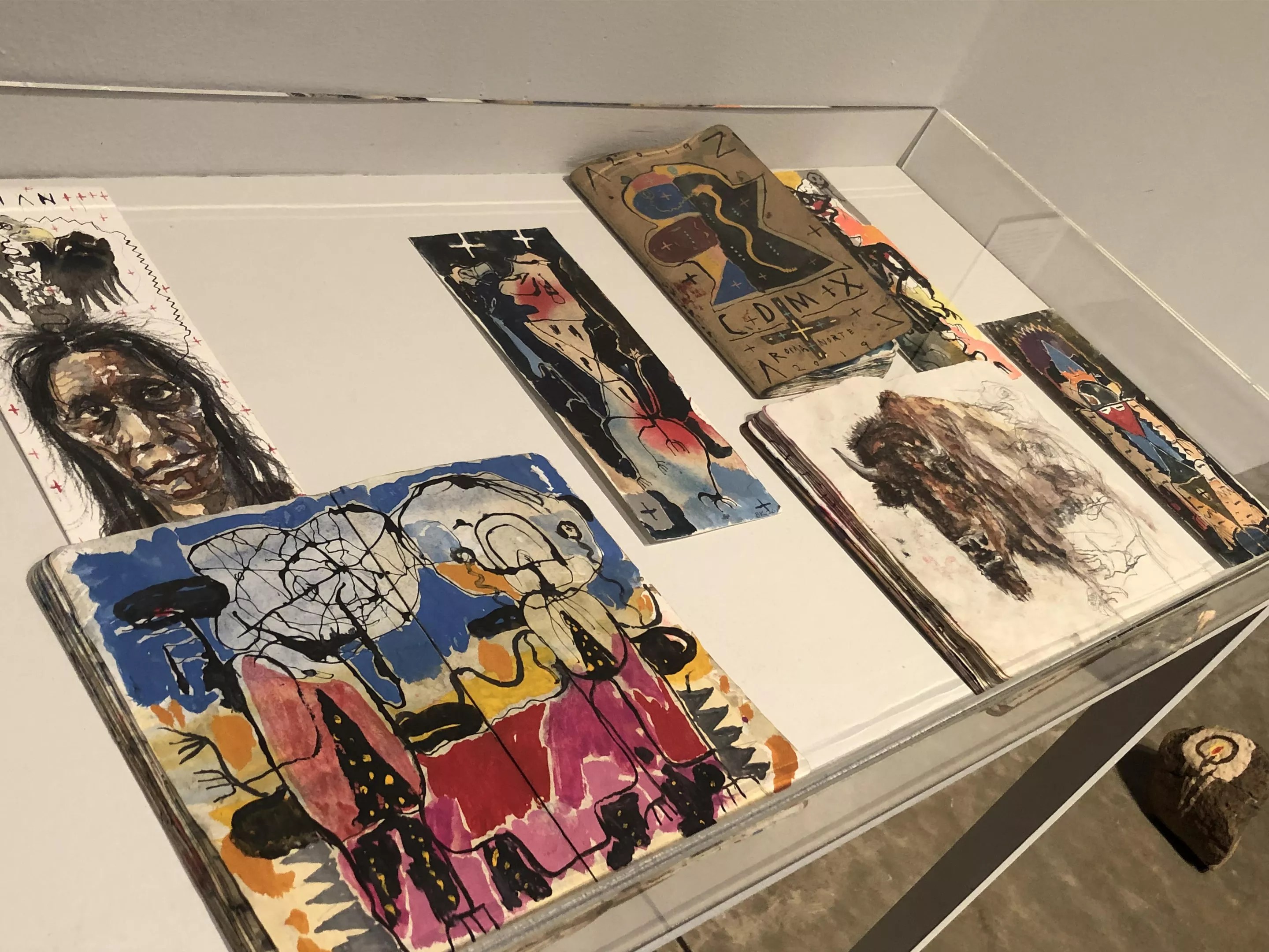 Indeed, “Swap Meet” has a little of everything: Kahlhamer’s sketchbooks inspired by his travels; painted rocks that are reminiscent of petroglyph art; a giant wire dreamcatcher crafted from smaller dreamcatchers; and more.