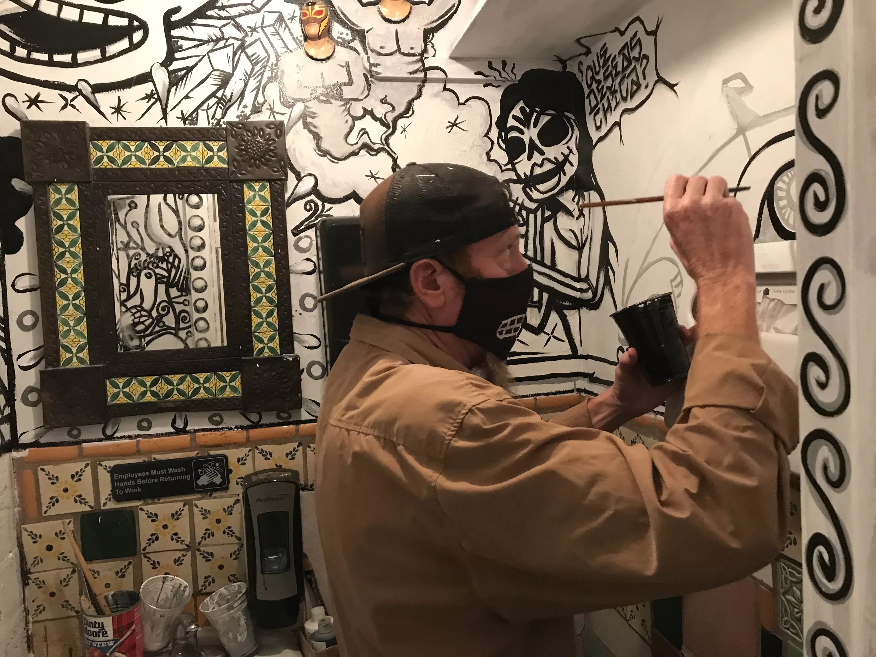 Esparza hopes to open this fresh take on Barrio Café in June, which will mark the restaurant’s 18th birthday. In the meantime, artists are coming and going from the space, sporting masks that serve as a reminder of the pandemic in their midst. Luna wore a mask decorated with his own art Thursday night, painting around bathroom wall elements ranging from small ceramic lucha libre masks to a mosaic-framed mirror.