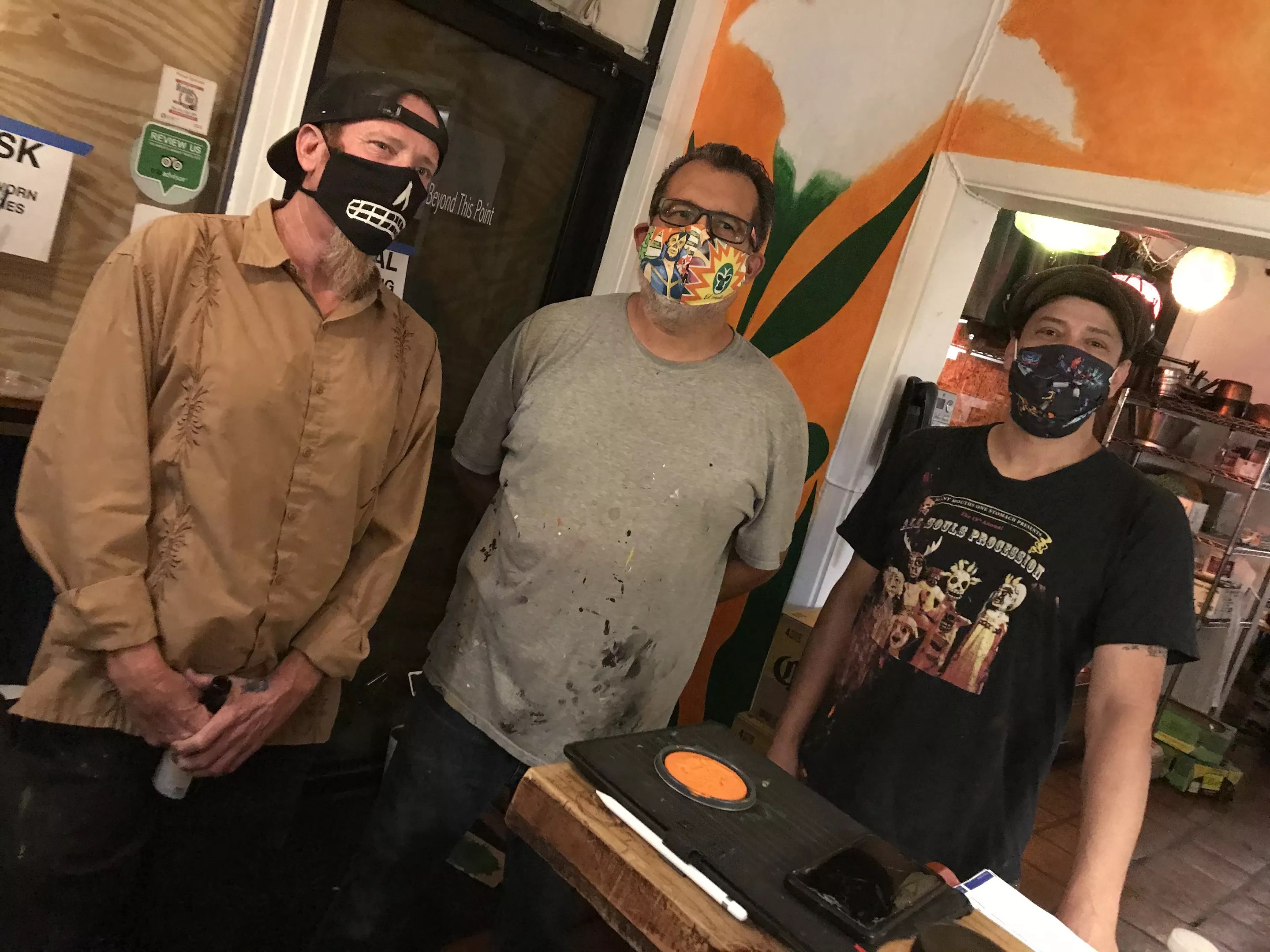 From left: Pablo Luna, Lalo Cota, and Tato Caraveo pause from painting while Chef Silvana takes photos.