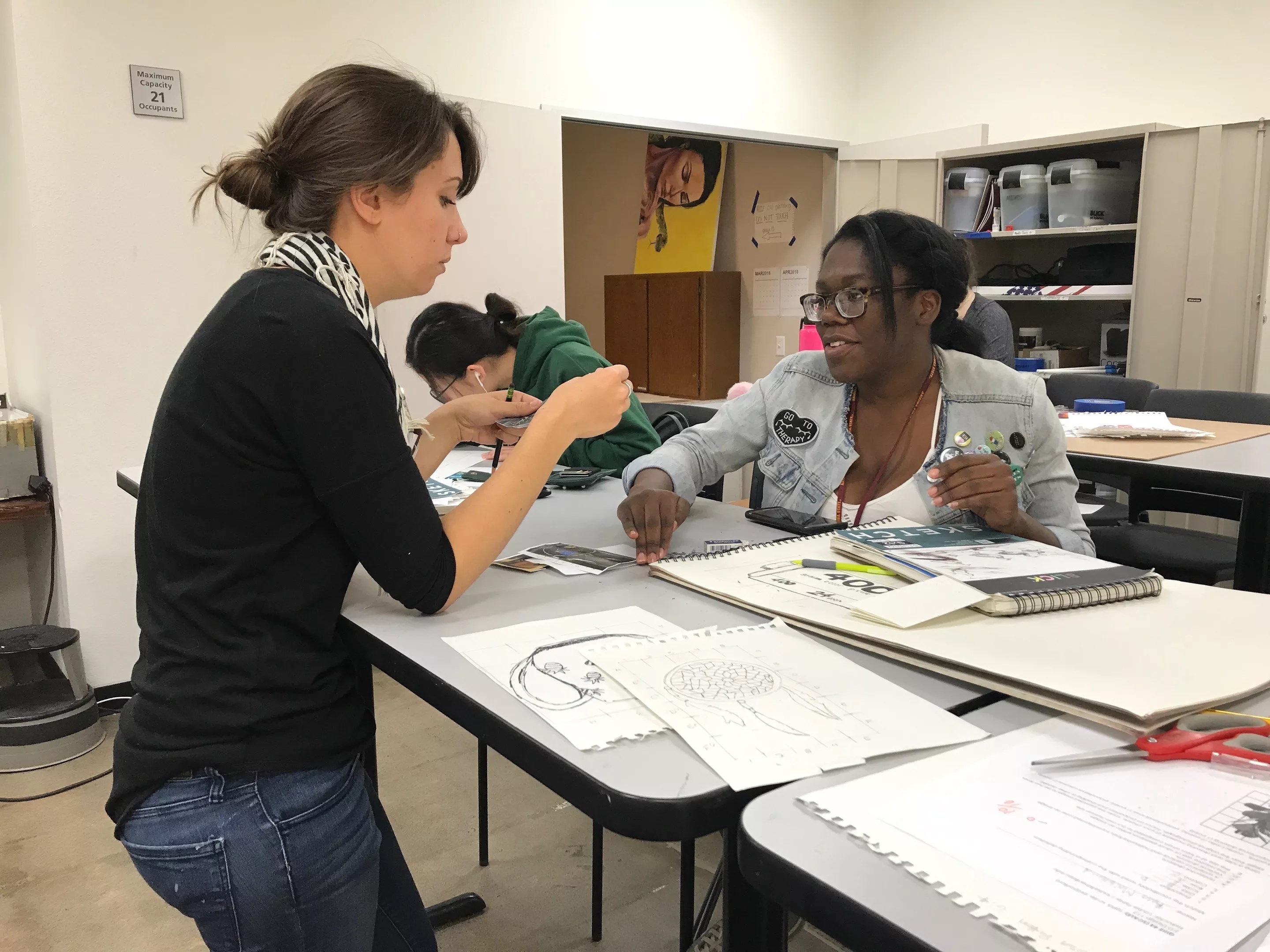 That same Tuesday morning, Louise Fisher, a graduate teaching assistant with the School of Art, was working with another classroom of students on drawing skills. As Fisher worked her way around the room, she helped a dozen or so students flesh out ideas.