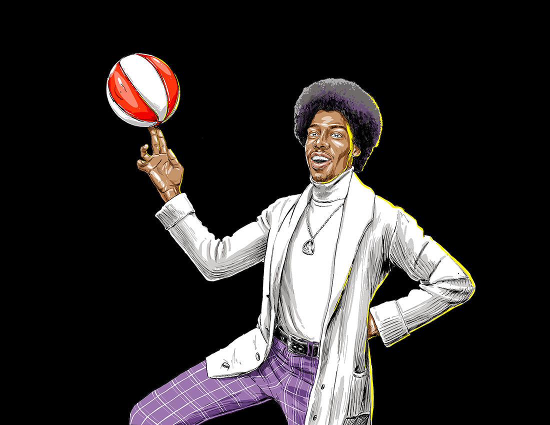 I like that era because we get Walt Frazier, we get Dr J., we get Artis Gilmore. My favorite picture, one of them at least, is a picture of Pistol Pete, a white guy. I used to watch his basketball tapes when I was young, and he was one of the best ball-handlers ever. And he was really flamboyant and there’s actually a photo that I found, and he has a butterfly collar on, and glasses on, and a suit, and a chain with his name on it. I’m like, wow, this is really reflective of how he played. So I like when the fashion seems to represent a person’s personality or character.