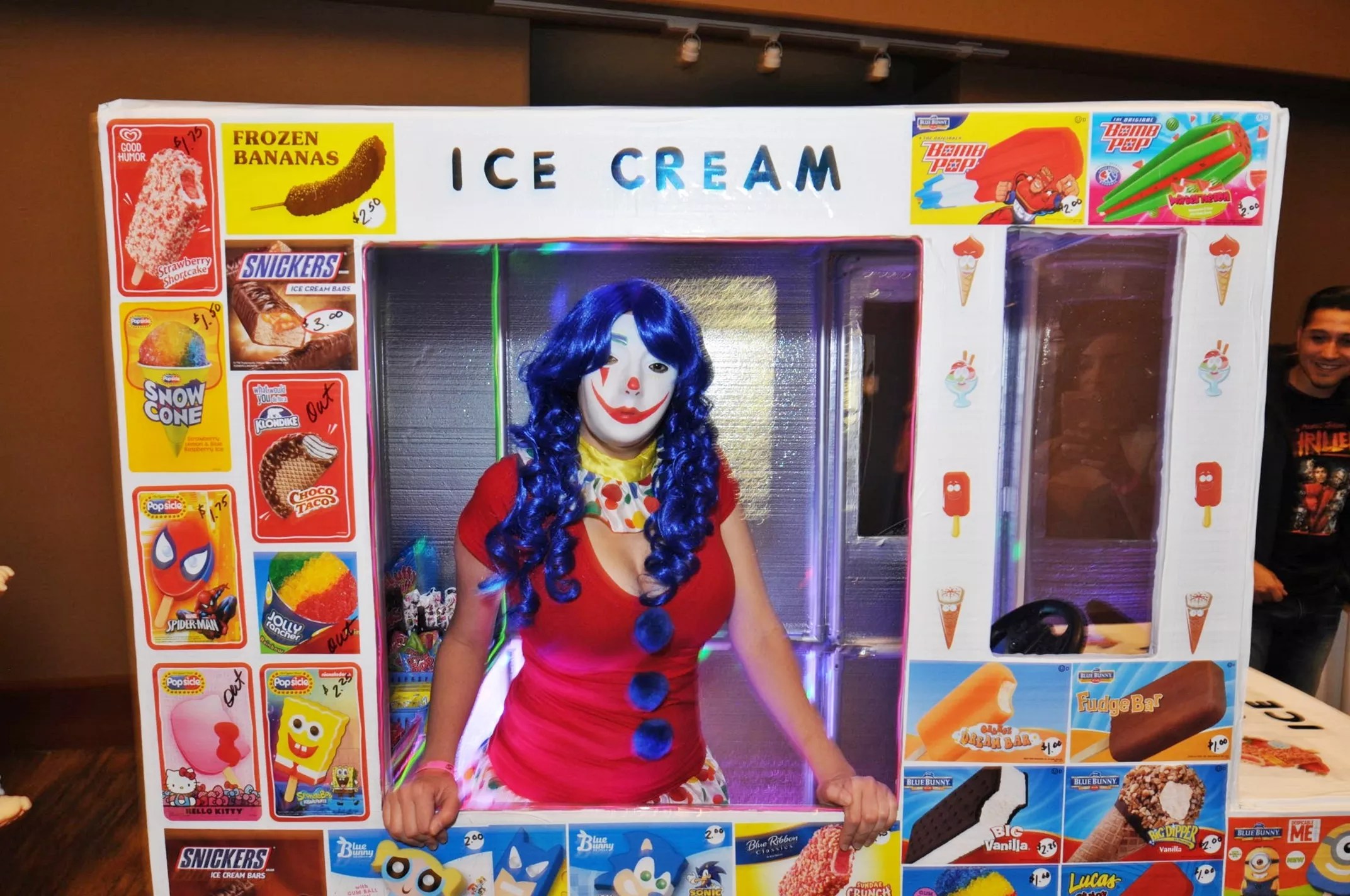 Creepy doesn’t even begin to describe this hard-to-miss sight we spotted at the Wicked Ball. Operated by an insidious looking female clown, it cruised around the lobby area of the event blaring its chimes and dispensing actual ice cream bars and Popsicles to people.