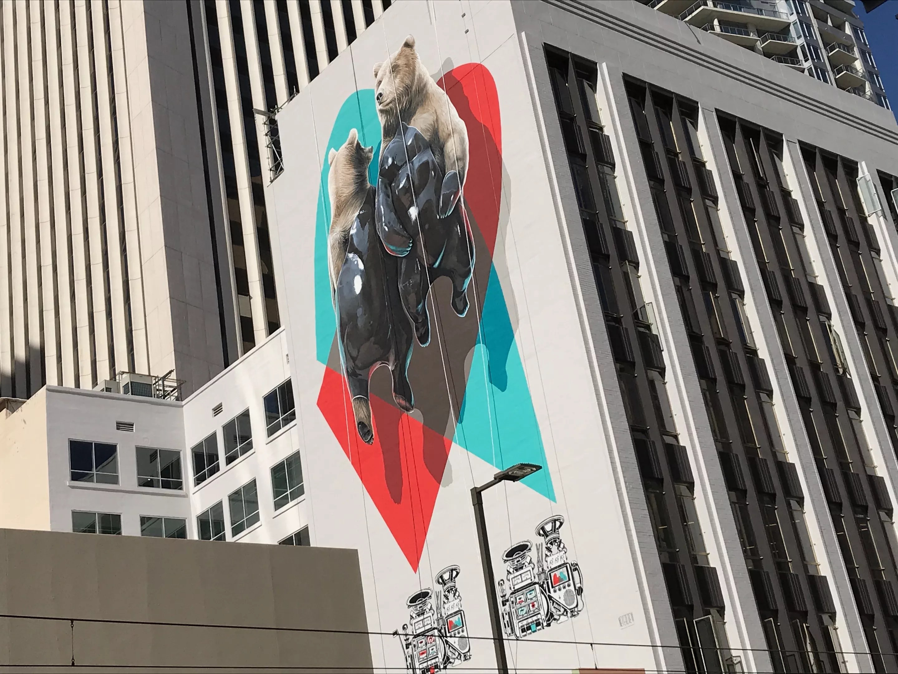 The Swiss-based collective, comprising artists Christian Rebecchi and Pablo Tagni, completed three interconnected murals at the Heard building on Central Avenue between Monroe and Adams streets. The murals were curated by Anne-Laure Lemaitre of FatCap Agency, a New York- and Paris-based firm that specializes in street art décor. The main piece, which rises 100 feet over downtown Phoenix, features a pair of bears and two small machines placed beneath them. An image inside the building lobby references the building’s historical ties to media companies, as does a third image on a northern wall off an alley.