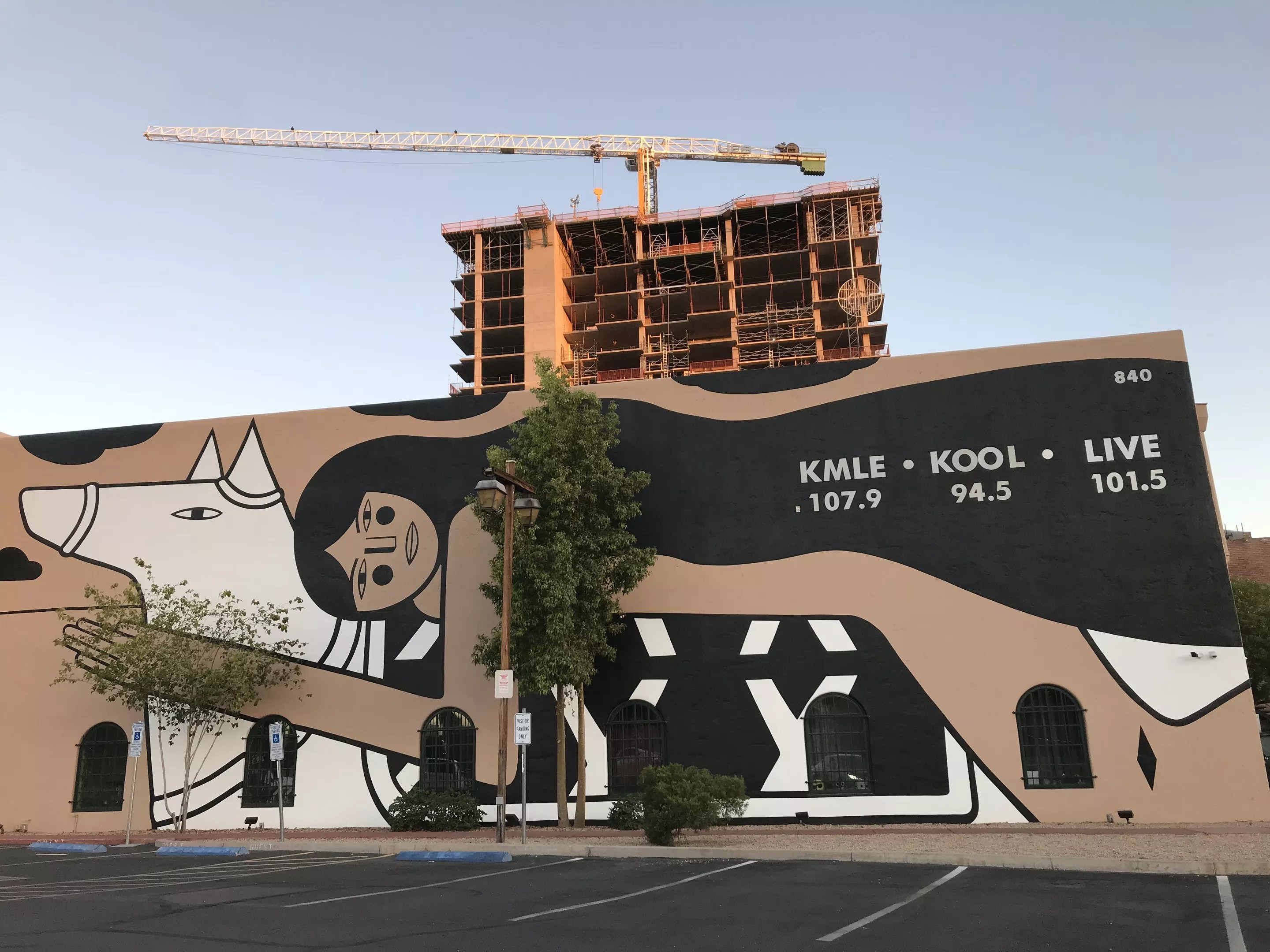 Phoenix-based artist Tato Caraveo painted a 120-foot mural on the south-facing wall of Arizona Opera in March. The mural shows a couple holding bubble wands, sitting back-to-back on a grass knoll beneath a sunset sky. JJ Horner helped paint portions of the landscape, which includes desert plants and flowers. It’s part of a larger art project commissioned by Lennar, the Florida-based firm that recently developed the Muse Apartments adjacent to Arizona Opera. The project was spearheaded by Curator Engine, a Phoenix-based company that connects businesses and other art buyers with local creatives.