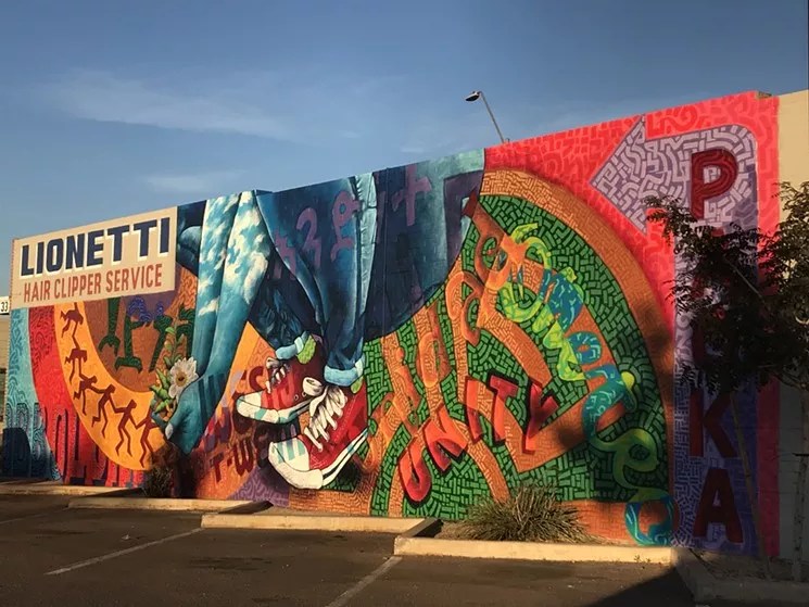 A strip of McDowell Road called Miracle Mile became significantly brighter following the addition of a new mural that blended the talents of established artist Jeff Slim and emerging artist Edgar Fernandez. The two men drew inspiration from the diversity of the neighborhoods surrounding the mural in creating their 14-foot high and 60-foot long piece, anchored by a figure holding soil that symbolizes the region’s Indigenous roots. Elaborate line work flanking the central images draws on symbolism used in O’odham pottery, and includes the word “Unity” written in several languages used by people living in the community. The mural, which is on the side of the Lionetti Hair Clipper Service building, is distinguished by its mix of narrative and abstract elements and the ways it mirrors the cultural richness of its setting. Although the artists have very different styles, they’re beautifully blended to create this work celebrating life, culture, and creativity.