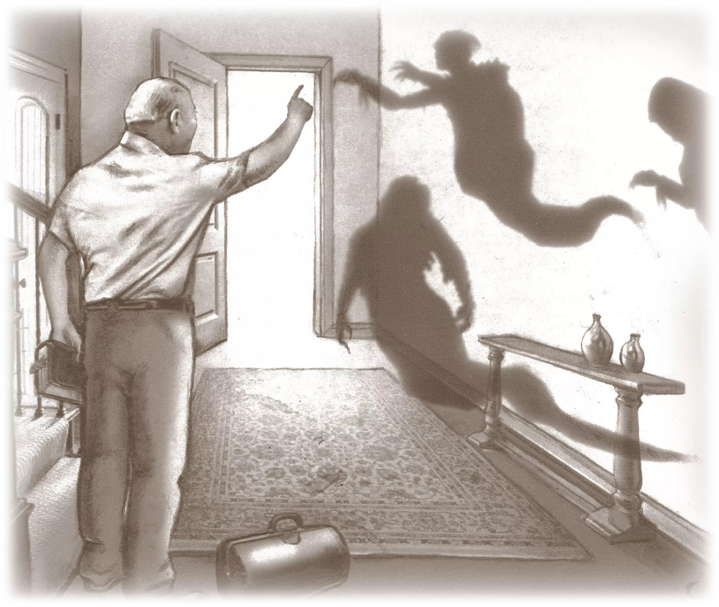 The day of my appointment, Robert parked on the opposite side of the street two houses down, like the cops do when they don’t want the perp to know they’re on the scene. I studied him through my peephole as he approached the door. He looked normal, like somebody’s grandpa – mostly bald with gentle, brown eyes, no tattoos, no piercings, and wearing khakis and a polo shirt. He was empty-handed. What did he plan on tackling my spirits with?, I wondered. He should have been more battle-ready, in my opinion – armed with a cross and a Star of David dangling from his neck, a couple of smudge sticks, holy water, crystals (I read online that black tourmaline’s a shield against negative energy), and maybe a fat, white candle, all poking out of a sagging, black backpack. There was none of that.