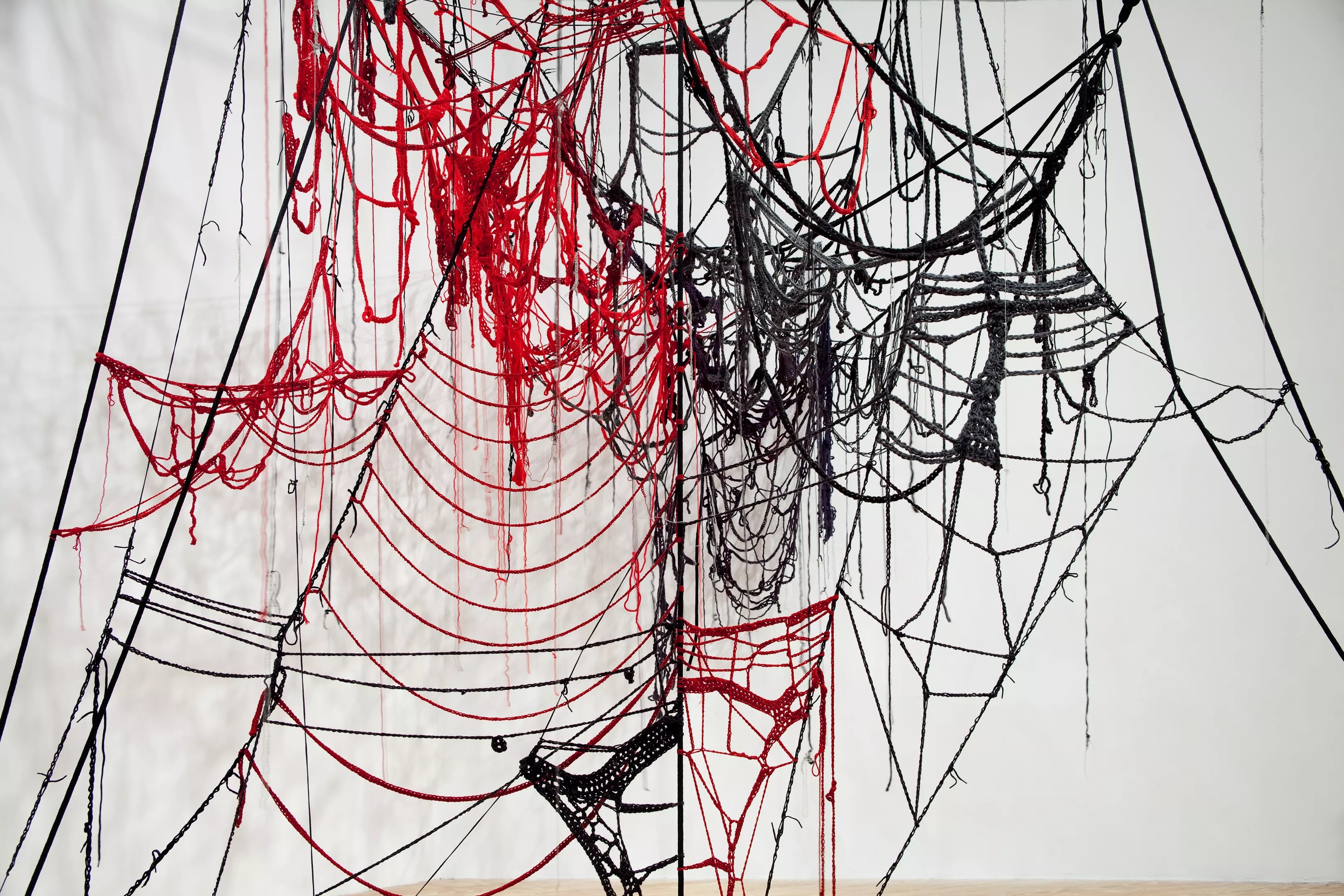 Sheila Pepe, Common Sense II, 2010. Crocheted baby and worsted weight yarns, rope, and community participation. Installation view, Hand + Made: The Performative
