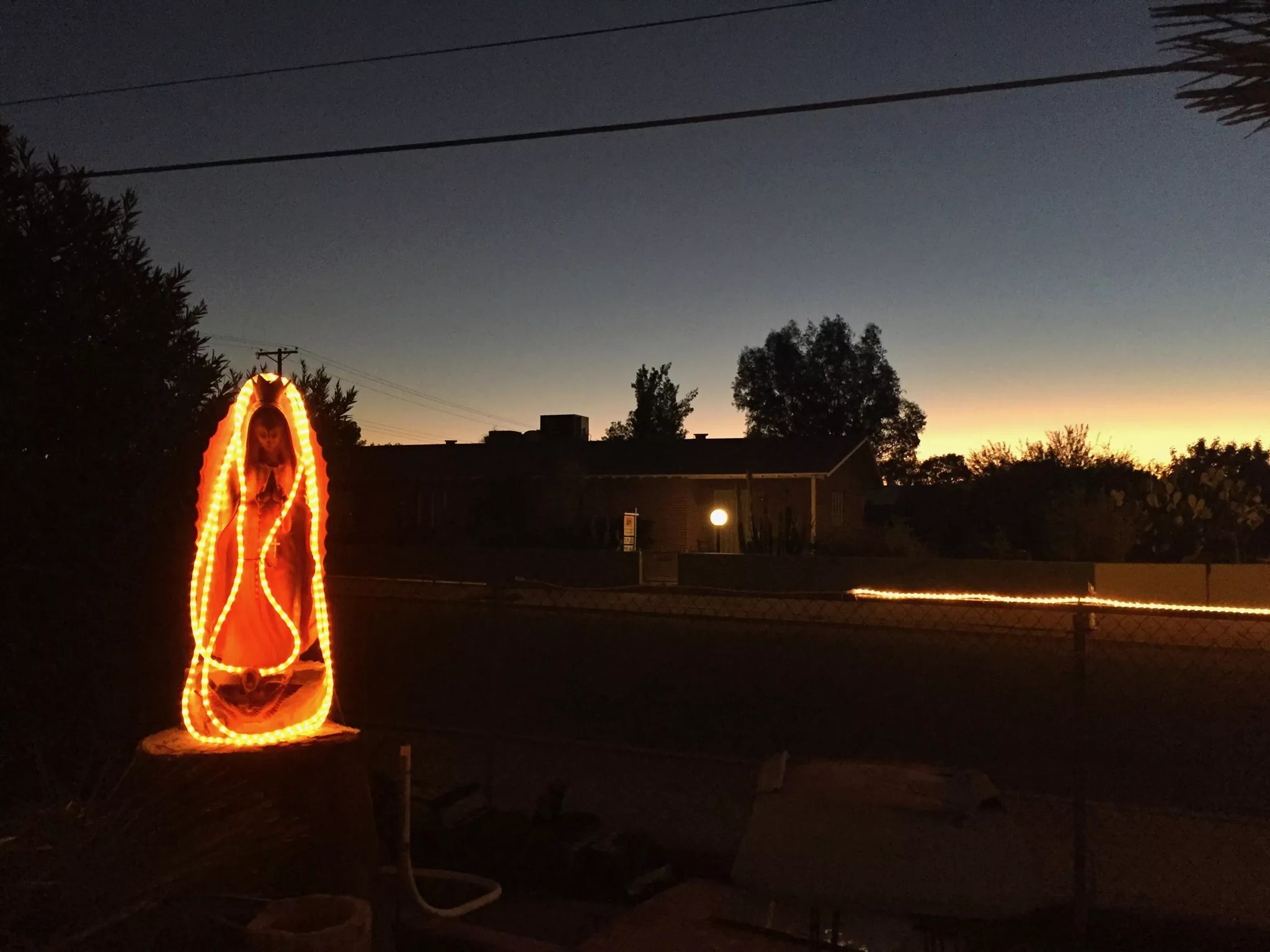 I’d pass lovely Our Lady of Guadalupe grottos, three on my walk. Each was set in a chain-linked yard of hard dirt and sagebrush. I’d tell myself that these Virgin Marys were too graceful to surrender to the heat. They soothed in cyan and magenta, in rosaries and beeswax. They provided a few square feet of guilt and reclamation, particularly on the return walk, when it was dark and after I’d downed some beer. Sundown always triggered that need to crack the day’s first beer. Alcohol beautified the transition from ugly day into beautiful evening. The crooked power lines and untrimmed palm trees stood quiet guard on the suddenly restive streets, which stretched into darkness lit on both sides by porches and living rooms.